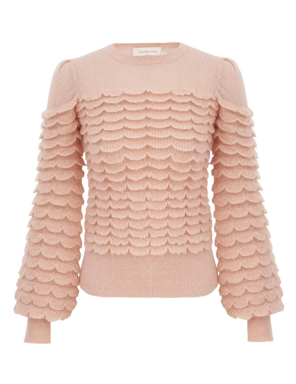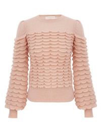 ITEM DETAILS The Hypnotic Scallop Sweater in Light Pink from our Fall 2025 Collection, Hypnotic. A long sleeve mohair blend sweater featuring a rounded neckline, softly gathered shoulders and tiered scalloped detailing across the body and sleeves. - Mohair blend knit - Round neckline with subtle shoulder gathers - Tiered scalloped detailing across front, back and sleeves - Ribbed cuffs and hem Style Code: 8211TF251 SIZE DETAILS 0P 0 1 2 3 4 Length 49 53 54 54 55 55 Bust 76 80 86 92 98 102 Waist 68 72 78 84 90 94 Sleeve 59 63 64 65 65 66 Designed for a regular fit This garment fits true to size Available in size 0P, suited to clients who are under 5'3"/ 160cm Model is 5'9.5"/178 cm, bust size 32C/10C and wears a size 0 Item measurements have been rounded to the nearest cm CARE INSTRUCTIONS 50% mohair 34% polyamide 16% wool Dry clean only code f (hydrocarbon only); Remove any detachable trims prior to dry cleaning; Cover to protect trim; Cool iron with protective cloth; Do not spot clean; Store garment flat do not hang Always check the label or care card for specific care instructions.