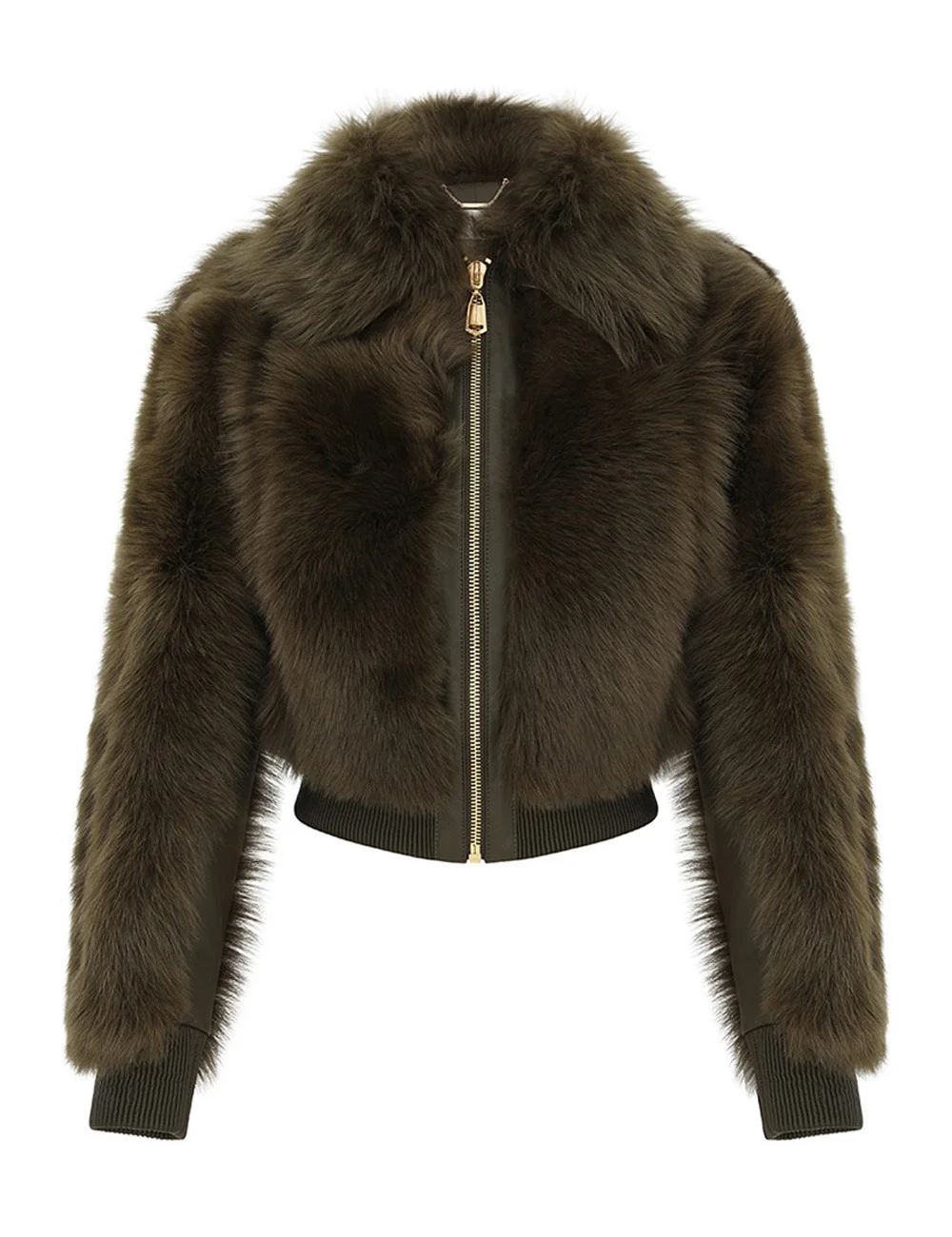 ITEM DETAILS The Hypnotic Shearling Bomber in Olive from our Fall 2025 Collection, Hypnotic. A shearling bomber jacket featuring a classic collar, elasticated cuffs, and front zip closure. - Sheep shearling cropped jacket - Elasticated ribbed cuffs and hem - Gold front zip closure - Side functional pockets Style Code: 5110JF251 SIZE DETAILS 0P 0 1 2 3 4 Length 42 46 46 47 47 48 Bust 100 106 110 116 120 126 Sleeve 51 55 56 56 57 58 Designed for an oversized, cropped fit This garment fits true to size Available in size 0P, suited to clients who are under 5'3"/ 160cm Model is 5'9.5"/178 cm, bust size 32C/10C and wears a size 0 Item measurements have been rounded to the nearest cm CARE INSTRUCTIONS Main: sheep shearling; contrast: lamb leather; lining: 75% viscose, 25% silk Clean professionally by a specialist leather and suede expert; Do not dry clean; Avoid water; Due to the nature of this garment colour may transfer onto clothing, accessories or furnishings Always check the label or care card for specific care instructions.
