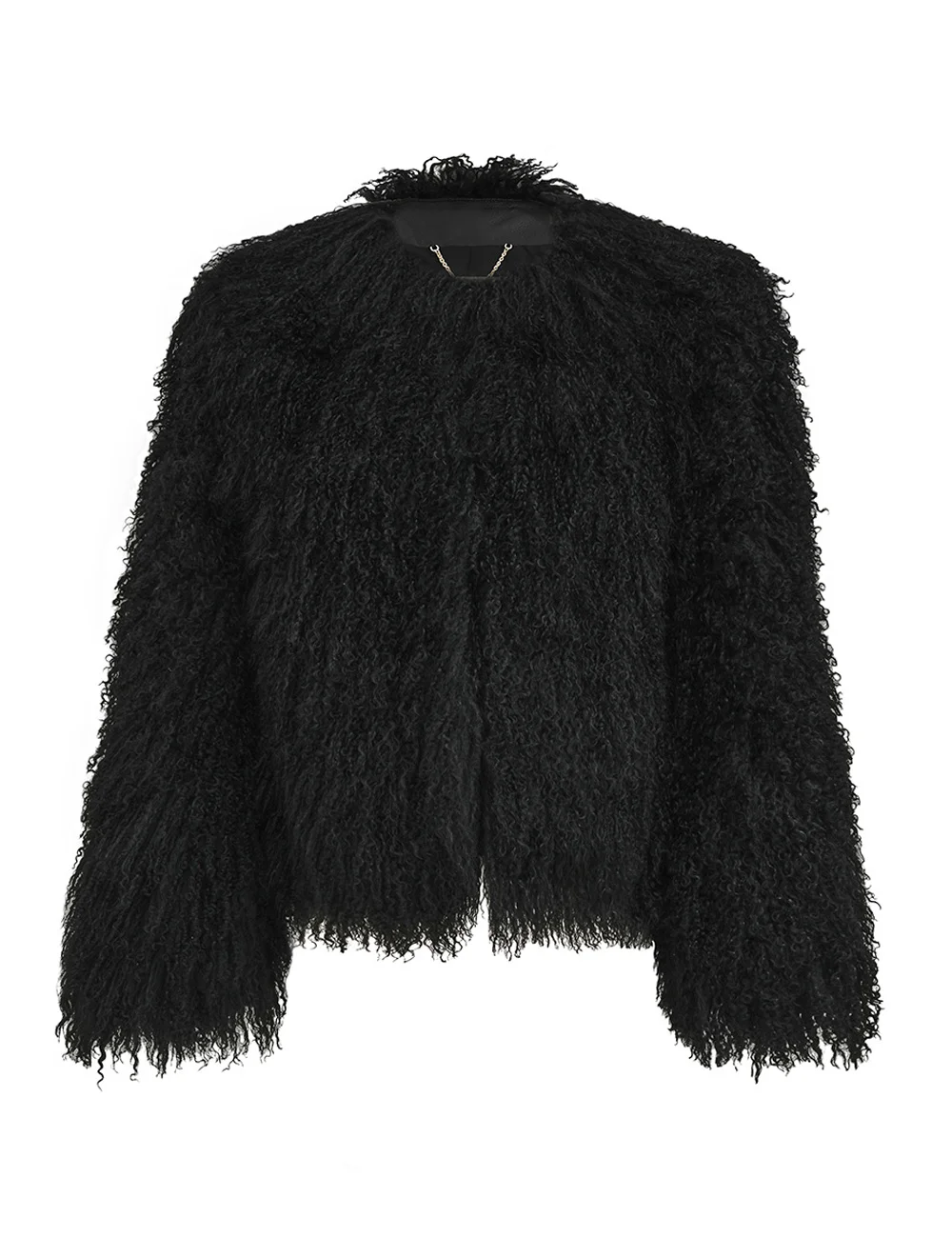 ITEM DETAILS The Hypnotic Shearling Jacket in Black from our Fall 2025 Collection, Hypnotic. A collarless shearling jacket with a straight silhouette. - Sheep shearling jacket - Front pockets - Hook and eye fastenings for centre front closure - Round, collarless neckline - Sheep leather lining Runway: This style was featured on the F25 Runway. Style Code: 5492JF251 SIZE DETAILS S M L Length 59 60 61 Bust 104 114 124 Sleeve 61 63 64 Designed for a relaxed, oversized fit This garment fits true to size Available in size 0P, suited to clients who are under 5'3"/ 160cm Model is 5'9.5"/178 cm, bust size 32C/10C and wears a size 0 Item measurements have been rounded to the nearest cm CARE INSTRUCTIONS Main: sheep shearling; lining: sheep leather; lining: 75% viscose, 25% silk Clean professionally by a specialist leather and suede expert; Do not dry clean; Avoid water; Due to the nature of this garment colour may transfer onto clothing, accessories or furnishings Always check the label or care card for specific care instructions.