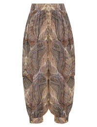 ITEM DETAILS The Hypnotic Silk Harem Pant in Denim Paisley from our Fall 2025 Collection, Hypnotic. A high waisted silk harem pant with a gathered waist and fitted ankle cuffs. - 100% silk fabric - Buttoned ankle cuffs - Side pockets - Heavily gathered throughout - Invisible zip closure at centre back Runway: This style was featured on the F25 Runway. Style Code: 4843PF251 SIZE DETAILS 0P 0 1 2 3 4 Length 34.5 38 38 38 38.5 39 Waist 27 28.5 30 32.5 34.5 36 Inseam 23 25 25 25 25 25 Designed to be slightly fitted at the waist, loose at the hip and through the legs High-rise waist with a full-length leg This garment fits true to size Available in size 0P, suited to clients who are under 5'3"/ 160cm Model is 5'9.5"/178 cm, bust size 32C/10C and wears a size 0 Item measurements are in inches CARE INSTRUCTIONS Main: 100% silk Dry clean only code f (hydrocarbon only); Remove any detachable trims prior to dry cleaning; Cover to protect trim; Cool iron with protective cloth; Light steam only; Do not spot clean Always check the label or care card for specific care instructions.