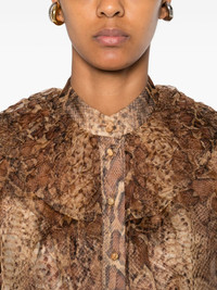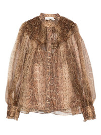 ruffle-trimmed silk shirt Highlights - Brown - Snake print - Ruffled collar - Button fastening - Long sleeves - Ruffled cuffs - Silk Imported Composition Lining: Recycled Polyester 86%, Elastane 14% Outer: Silk 100% SIZE & FIT Model measurements Height 5 ft 10 in(1.77 m) Bust/Chest 33.07 in(84 cm) Hips 37 in(94 cm) Waist 24.8 in(63 cm) Washing instructions Hand Wash