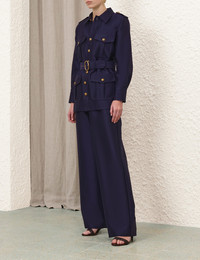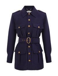 ITEM DETAILS The Hypnotic Utility Jacket in Ink from our Fall 2025 Collection, Hypnotic. A utility jacket featuring a belted waist and gold military-style buttons down the centre front and at the cuffs. - Wool blend jacket - Long sleeves with gathered cuffs - Adjustable, removable buckle belt - Classic collar - Gold buttons at front closure and shoulder tabs - Functional flap pockets throughout - Fully lined Style Code: 4124JF251 SIZE DETAILS 0P 0 1 2 3 4 Length 26.5 28.5 28.5 29 29 29.5 Bust 36 38.5 41 42.5 45 46.5 Waist 36 38 40 41.5 44 46.5 Sleeve 17.5 19.5 19.5 19.5 20 20.5 Tailored with a relaxed fit This garment fits true to size Available in size 0P, suited to clients who are under 5'3"/ 160cm Model is 5'9.5"/178 cm, bust size 32C/10C and wears a size 0 Item measurements are in inches CARE INSTRUCTIONS Main: 92% wool, 8% silk; lining: 75% viscose, 25% silk Dry clean only code f (hydrocarbon only); Remove any detachable trims prior to dry cleaning; Cover to protect trim; Cool iron with protective cloth; Light steam only; Do not spot clean Always check the label or care card for specific care instructions.