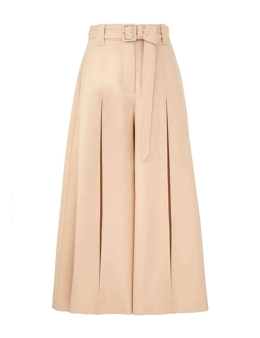 ITEM DETAILS The Hypnotic Wool Culotte in Cream from our Fall 2025 Collection, Hypnotic. A wool flared culotte pant featuring front and back splits, and a removable self covered belt. - Centre front fly zip and button closure - Belt loops along waistband - Removable buckle belt - Side pockets - Front and back splits - Fully lined Runway: This style was featured on the F25 Runway. Style Code: 4742PF251 SIZE DETAILS 0P 0 1 2 3 4 Length 30.5 34 34 34.5 34.5 34.5 Waist 25 27 28.5 30.5 32.5 34.5 Hip 37 39.5 41.5 43.5 45.5 47 Inseam 20.5 23 23 23 23 23 Designed to be fitted at the waist, relaxed through the hips and legs Mid-rise waist with a three-quarter length leg This garment fits true to size Available in size 0P, suited to clients who are under 5'3"/ 160cm Model is 5'9.5"/178 cm, bust size 32C/10C and wears a size 0 Item measurements are in inches CARE INSTRUCTIONS Main: 98% wool, 2% elastane; lining: 75% viscose, 25% silk Dry clean only code f (hydrocarbon only); Remove any detachable trims prior to dry cleaning; Cover to protect trim; Do not steam; Cool iron with protective cloth; Do not spot clean Always check the label or care card for specific care instructions.