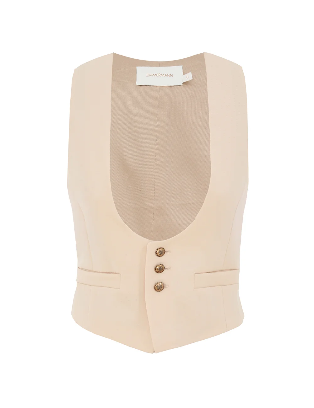 ITEM DETAILS The Hypnotic Wool Vest in Cream from our Fall 2025 Collection, Hypnotic. A wool vest featuring a deep V-neckline, buttons on the centre front closure, and mock pockets. - Plunging neckline - Back buckle strap - Double side mock pockets - Buttons down the centre front - Fully lined Runway: This style was featured on the F25 Runway. Style Code: 4838JF251 SIZE DETAILS 0P 0 1 2 3 4 Length 16.5 17.5 17.5 18 18.5 18.5 Bust 31.5 34 35.5 38 39.5 41.5 Designed for a tailored fit This garment fits true to size Available in size 0P, suited to clients who are under 5'3"/ 160cm Model is 5'9.5"/178 cm, bust size 32C/10C and wears a size 0 Item measurements are in inches CARE INSTRUCTIONS Main: 98% wool, 2% elastane; contrast and lining: 100% viscose Dry clean only code f (hydrocarbon only); Remove any detachable trims prior to dry cleaning; Cover to protect trim; Do not steam; Cool iron with protective cloth; Do not spot clean Always check the label or care card for specific care instructions.