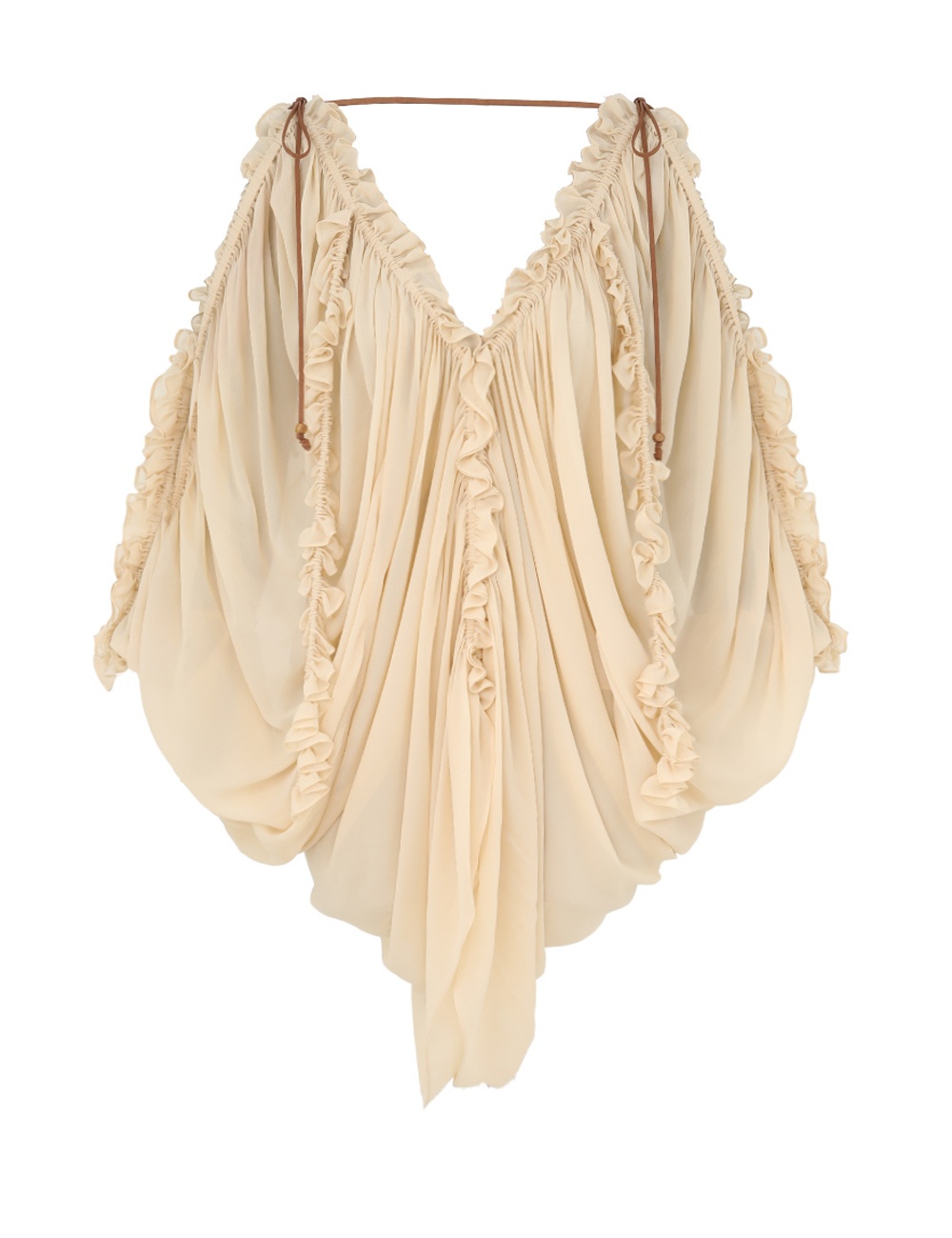 ITEM DETAILS The Illuminate Draped Blouse in Tea from our Spring 2025 Collection, Illumination. A loose fit blouse featuring a deep V-neckline, draped shoulders with elasticated cuffs, and dramatic sleeve cutouts, finished with heavy gathering and ruffles throughout. - Heavily gathered blouse - Deep V-neckline and back - Suede tie detailing with beads - Long draped shoulders with elasticated cuffs - Sleeve cutouts - Comes with separate cami Runway: This style was featured on the S25 Runway. Style Code: 2904TS251 SIZE DETAILS 0P 0 1 2 3 4 Length 60 63 63 63 63 63 Sleeve 57 60 60 60 60 60 Loose fit This garment fits true to size Available in size 0P, suited to clients who are under 5'3"/ 160cm Model is 5'9.5"/178 cm, bust size 32C/10C and wears a size 0 Item measurements have been rounded to the nearest cm CARE INSTRUCTIONS Main: 100% viscose, slip: 100% viscose Dry clean only code f (hydrocarbon only); Cover to protect trim; Cool iron with protective cloth; Do not spot clean ; Dry clean only code f (hydrocarbon only); Cover to protect trim; Cool iron with protective cloth; Do not spot clean ; Always check the label or care card for specific care instructions.