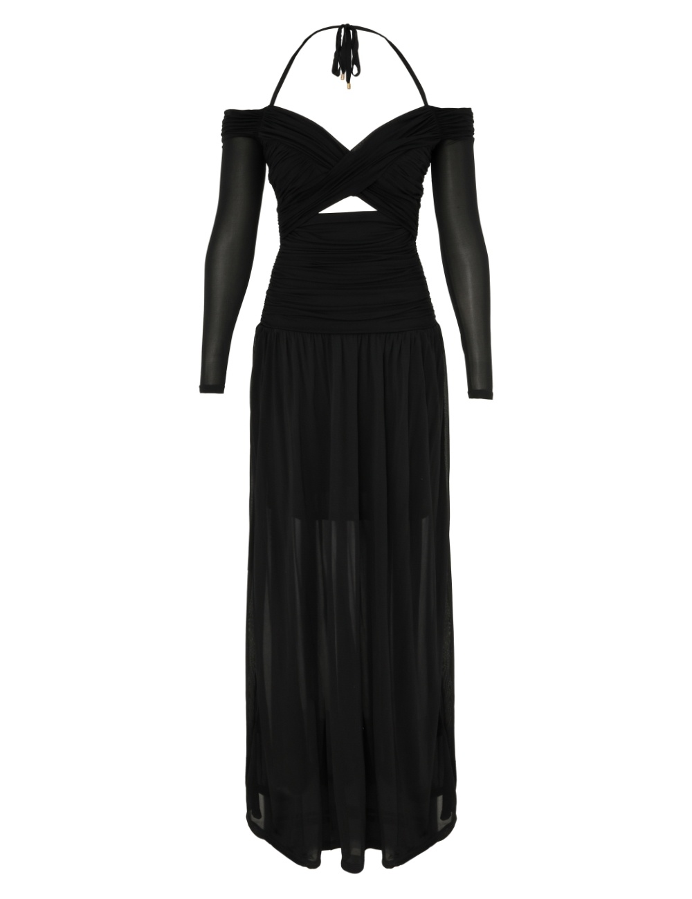 ITEM DETAILS The Illuminate Draped Maxi Dress in Black from our Spring 2025 Collection, Illumination. A full-length dress featuring a criss-cross gathered bust and off-shoulder sleeves with halter neck strap. - Off-shoulder maxi dress - Heavy gathering at bust, back and skirt - Boning at the sides - Cut out detail under bust - Halter neck strap with self ties and toggles at the ends - Centre back zip closure Style Code: 2784DS251 SIZE DETAILS 0P 0 1 2 3 Length 115 127 128 128 129 Bust 70 76 80 86 90 Sleeve 47 50 50 50 51 Waist 52 56 62 66 72 Fitted through the bodice and waist Relaxed through the legs This garment fits true to size Available in size 0P, suited to clients who are under 5'3"/ 160cm Model is 5'9.5"/178 cm, bust size 32C/10C and wears a size 0 Item measurements have been rounded to the nearest cm CARE INSTRUCTIONS Main and lining: 100% viscose Dry clean only code f (hydrocarbon only); Remove any detachable trims prior to dry cleaning; Cover to protect trim; Do not steam; Cool iron with protective cloth; Do not spot clean Always check the label or care card for specific care instructions.