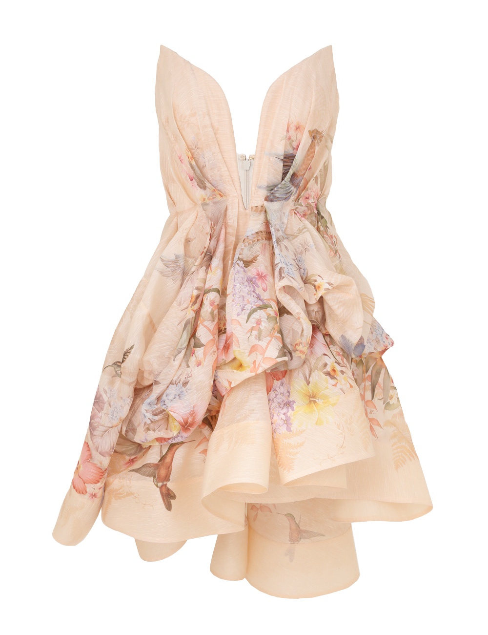 ITEM DETAILS The Illuminate Draped Mini Dress in Ivory Tropical from our Spring 2025 Collection, Illumination. A silk linen strapless mini dress featuring a deep plunge neckline, an asymmetrical high-low hemline, and a tucked draped bodice. - Silk linen mini dress - Placement print throughout - Centre back invisible zip closure with hook and eye - V-wire neckline - High-low hemline - Volume in skirt - Boning along the bodice Style Code: 3543DS251 SIZE DETAILS 0P 0 1 2 3 4 Length 73 77 77 77 77 77 Bust 74 78 84 88 94 98 Waist 64 66 72 76 82 86 Fitted through the bodice and waist Relaxed through the legs This garment fits true to size Available in size 0P, suited to clients who are under 5'3"/ 160cm Model is 5'9.5"/178 cm, bust size 32C/10C and wears a size 0 Item measurements have been rounded to the nearest cm CARE INSTRUCTIONS Main: 52% linen, 48% silk, bodice lining: 52% linen, 48% silk Dry clean only code f (hydrocarbon only); Remove any detachable trims prior to dry cleaning; Cover to protect trim; Cool iron with protective cloth; Light steam only; Do not spot clean Always check the label or care card for specific care instructions.