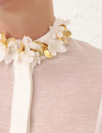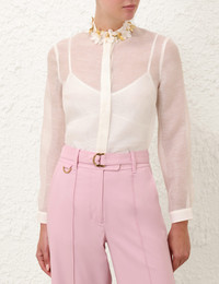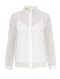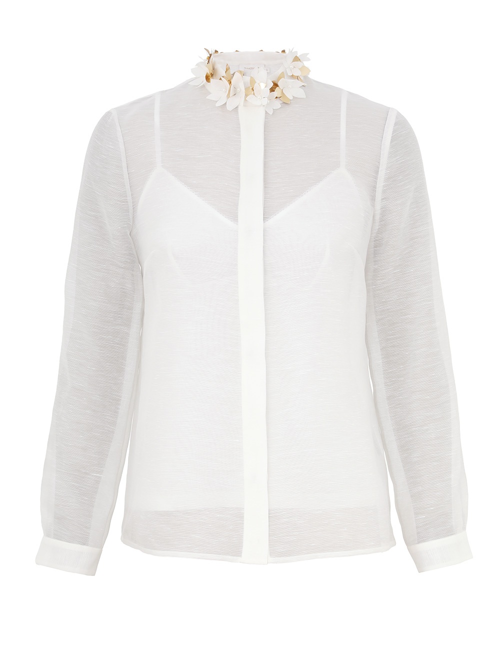 ITEM DETAILS The Illuminate Embellished Shirt in Ivory from our Spring 2025 Collection, Illumination. A silk linen shirt featuring a stand collar trimmed with 3D flowers and pearl beads, a concealed front placket, and tucks at the cuffs with buttons. - Silk linen shirt - Long slim sleeves with buttons at the cuffs - Concealed front placket - Stand collar with 3D flower trim - Box pleat at the centre back - Comes with separate cami Style Code: 4256TS251 SIZE DETAILS 0P 0 1 2 3 4 Length 61 65 65 66 67 67 Bust 97 102 107 112 118 123 Sleeve 52 56 57 58 58 59 Slim fit This garment fits true to size Available in size 0P, suited to clients who are under 5'3"/ 160cm Model is 5'9.5"/178 cm, bust size 32C/10C and wears a size 0 Item measurements have been rounded to the nearest cm CARE INSTRUCTIONS Main: 52% linen, 48% silk; slip: 86% recycled polyester, 14% elastane Dry clean only code f (hydrocarbon only); Remove any detachable trims prior to dry cleaning; Cover to protect trim; Cool iron with protective cloth; Light steam only; Do not spot clean Gentle cold hand wash separately with mild detergent Remove any detachable trims prior to cleaning Cover to protect trim; Do not soak, rub or wring Do not bleach Do not tumble dry Dry in shade Do not iron Do not spot clean Dry cleanable code f (hydrocarbon only) Always check the label or care card for specific care instructions.