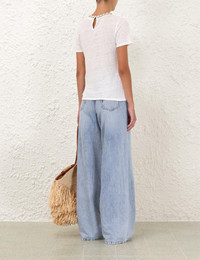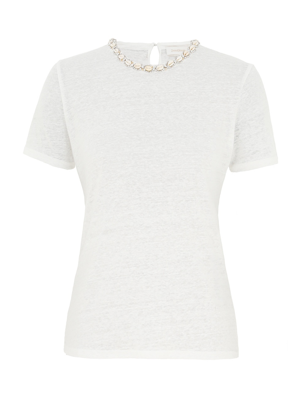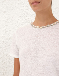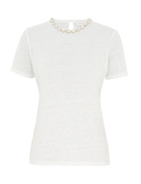 ITEM DETAILS The Illuminate Embellished Tee in Ivory from our Spring 2025 Collection, Illumination. A linen tee featuring short sleeves and a crew neckline with crystal and shell trim. - Linen tee - Short sleeves - Crystal and shell detailing on neckline - Centre back keyhole with loop and button - Double turn hemline Style Code: 3716TS251 SIZE DETAILS 0P 0 1 2 3 4 Length 52 56 57 58 58 59 Bust 76 82 88 92 98 102 Waist 72 76 82 88 92 98 Sleeve 18 19 19 20 20 21 Relaxed fit This garment fits true to size Available in size 0P, suited to clients who are under 5'3"/ 160cm Model is 5'9.5"/178 cm, bust size 32C/10C and wears a size 0 Item measurements have been rounded to the nearest cm CARE INSTRUCTIONS Main: 100% linen Dry clean only code f (hydrocarbon only); Remove any detachable trims prior to dry cleaning; Cover to protect trim; Cool iron with protective cloth; Light steam only; Do not spot clean Always check the label or care card for specific care instructions.