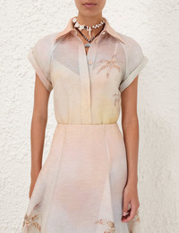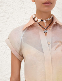ITEM DETAILS The Illuminate Fitted Blouse in Guava Seascape from our Spring 2025 Collection, Illumination. A silk linen organza blouse featuring short sleeves with rolled cuffs, a stand collar with a shell button detail, finished with concealed placket. - Silk linen organza blouse - Short sleeves with rolled cuffs - Stand collar with a shell button detail - Concealed placket with buttons down the centre front - Comes with separate cami Style Code: 4673TS251 SIZE DETAILS 0P 0 1 2 3 Length 57 61 62 62 63 Bust 83 88 93 98 103 Waist 77 80 84 90 95 Slim fit This garment fits true to size Available in size 0P, suited to clients who are under 5'3"/ 160cm Model is 5'9.5"/178 cm, bust size 32C/10C and wears a size 0 Item measurements have been rounded to the nearest cm CARE INSTRUCTIONS Main: 52% linen, 48% silk, slip: 86% recycled polyester, 14% elastane Dry clean only code f (hydrocarbon only); Remove any detachable trims prior to dry cleaning; Cover to protect trim; Cool iron with protective cloth; Light steam only; Do not spot clean Gentle cold hand wash separately with mild detergent Remove any detachable trims prior to cleaning Cover to protect trim; Do not soak, rub or wring Do not bleach Do not tumble dry Dry flat in shade Cool iron with protective cloth Do not spot clean Dry cleanable code p Always check the label or care card for specific care instructions.