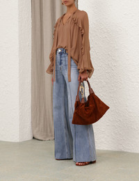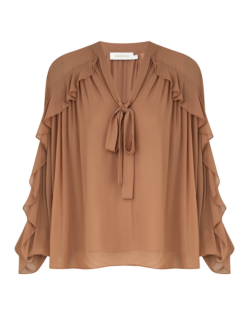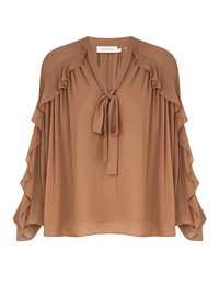 ITEM DETAILS The Illuminate Flutter Blouse in Tan from our Spring 2025 Collection, Illumination. A placement print blouse featuring a V-neckline with a self tie neck tie, long blouson sleeves with elasticated cuffs, and frill detailing at the shoulders, neckline, and down the sleeves. - Relaxed fit blouse - Self covered neck tie - Blouson sleeves with elasticated cuffs - Frill detailing throughout - Placement print - Lined Style Code: 4101TS251 SIZE DETAILS 0P 0 1 2 3 4 Length 60 64 64 65 66 66 Bust 143 148 153 158 163 168 Sleeve 60 64 64 65 66 66 Relaxed fit This garment fits true to size Available in size 0P, suited to clients who are under 5'3"/ 160cm Model is 5'9.5"/178 cm, bust size 32C/10C and wears a size 0 Item measurements have been rounded to the nearest cm CARE INSTRUCTIONS Main: 100% viscose; lining: 100% viscose Dry clean only code f (hydrocarbon only); Cover to protect trim; Cool iron with protective cloth; Do not spot clean ; Always check the label or care card for specific care instructions.