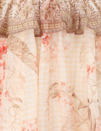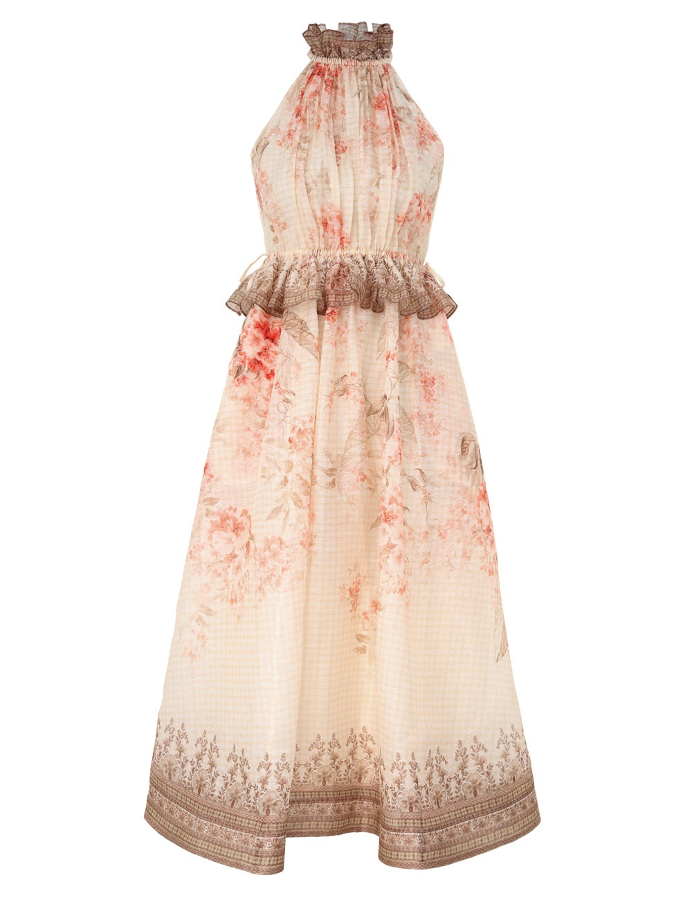 ITEM DETAILS The Illuminate Halter Midi Dress in Coral Floral from our Spring 2025 Collection, Illumination. A silk linen midi dress featuring a frilled stand collar, ruffle detailing at the waist with adjustable ties at the sides, finished with a center back zip closure and side seam pockets. - Silk linen midi dress - Waist ties with bead trims - Side seam pockets - Centre back invisible zip - Frilled neck and waist detailing - Halter neckline Style Code: 3975DS251 SIZE DETAILS 0P 0 1 2 3 4 Length 113 124 125 126 126 127 Bust 78 84 88 94 98 104 Waist 66 68 74 78 84 88 Hip 116 122 126 132 136 142 Fitted through the waist, relaxed through the hips and legs This garment fits true to size Available in size 0P, suited to clients who are under 5'3"/ 160cm Model is 5'9.5"/178 cm, bust size 32C/10C and wears a size 0 Item measurements have been rounded to the nearest cm CARE INSTRUCTIONS Main: 52% linen, 48% silk, lining: 100% cotton Dry clean only code f (hydrocarbon only); Remove any detachable trims prior to dry cleaning; Cover to protect trim; Cool iron with protective cloth; Light steam only; Do not spot clean Always check the label or care card for specific care instructions.