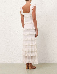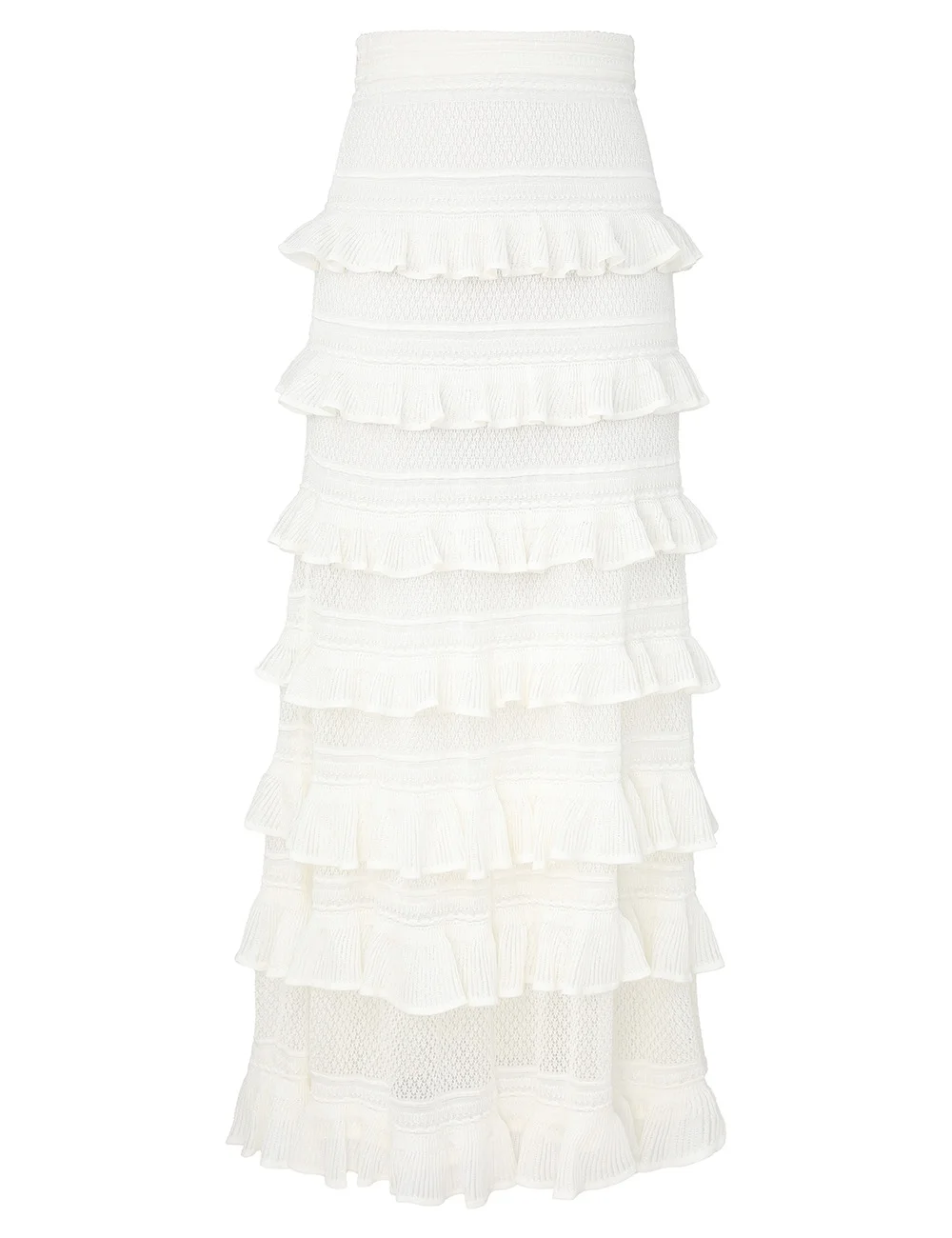 ITEM DETAILS The Luna Lace Frill Skirt in Ivory from our Spring 2026 Collection, Kindred Spirit. A knit midi skirt featuring an elasticated waistband and tiered ruffle details throughout. - Knit midi skirt - High waisted - Tiered ruffles - Elasticated waist - Slip on style Style Code: 3723SS261 SIZE DETAILS 0P 0 1 2 3 4 Length 80 88 88 88 88 88 Waist 58 62 66 72 76 82 Hip 78 84 88 94 98 104 Elastic waist for an easy fit This garment fits true to size Available in size 0P, suited to clients who are under 5'3"/ 160cm Model is 5'9.5"/178 cm, bust size 32C/10C and wears a size 0 Item measurements have been rounded to the nearest cm CARE INSTRUCTIONS Main: 93% viscose, 5% polyamide,2% polyester; lining: 100% viscose Dry clean only code f (hydrocarbon only); Remove any detachable trims prior to dry cleaning; Cover to protect trim; Iron in low temperature with protective cloth; Do not spot clean; Store garment flat do not hang Always check the label or care card for specific care instructions.