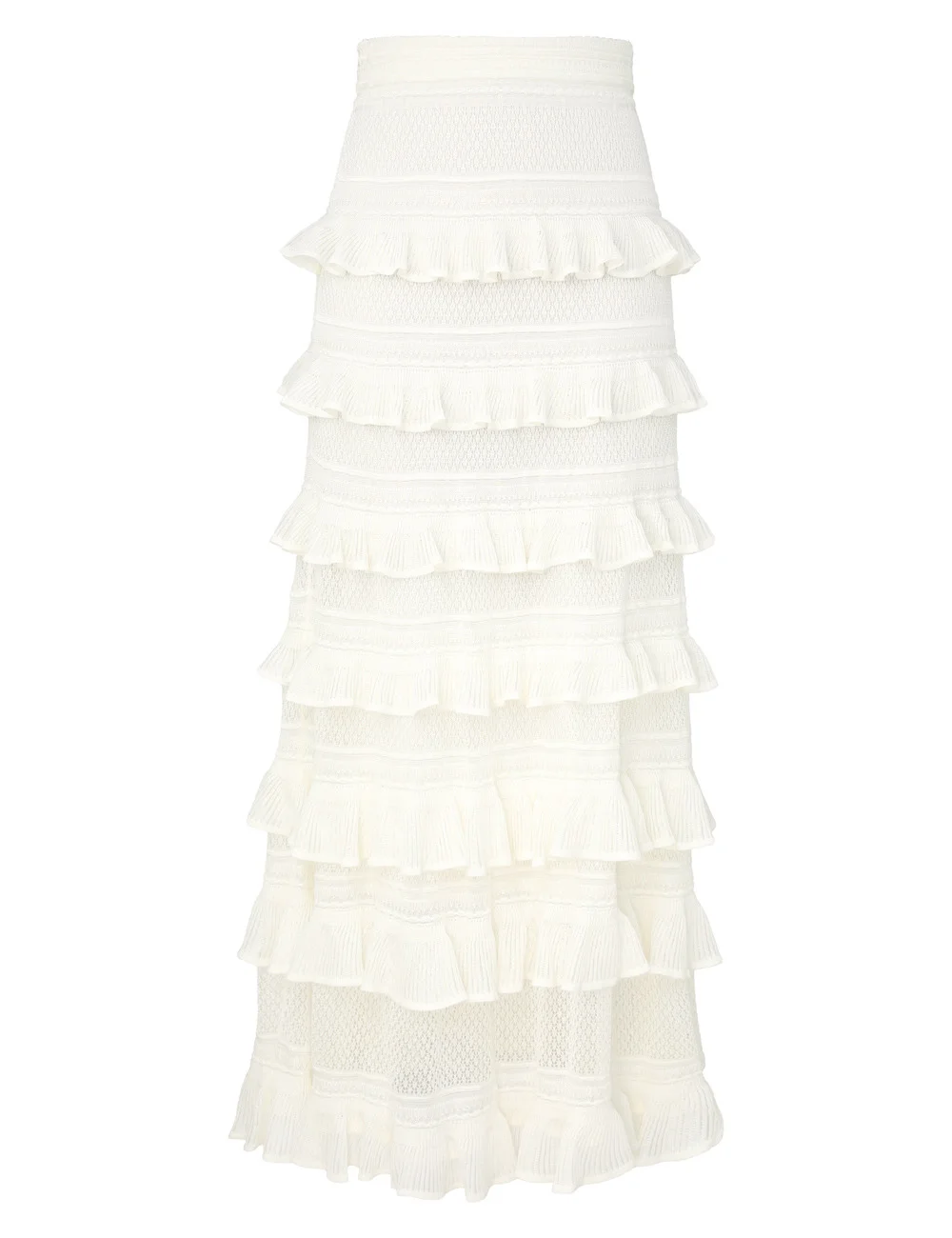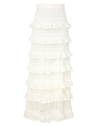 ITEM DETAILS The Hypnotic Lace Frill Skirt in Ivory from our Fall 2025 Collection, Hypnotic. A knit midi skirt featuring an elasticated waistband and tiered ruffle details throughout. - Knit midi skirt - High waisted - Tiered ruffles - Elasticated waist - Slip on style Style Code: 3723SF252 SIZE DETAILS 0P 0 1 2 3 4 Length 80 88 88 88 88 88 Waist 58 62 66 72 76 82 Hip 78 84 88 94 98 104 Elastic waist for an easy fit This garment fits true to size Available in size 0P, suited to clients who are under 5'3"/ 160cm Model is 5'9.5"/178 cm, bust size 32C/10C and wears a size 0 Item measurements have been rounded to the nearest cm CARE INSTRUCTIONS Main : 74% viscose 22% polyamide 4% polyester lining : 100% viscose Dry clean only code f (hydrocarbon only); Remove any detachable trims prior to dry cleaning; Cover to protect trim; Cool iron with protective cloth; Do not spot clean; Store garment flat do not hang Always check the label or care card for specific care instructions.