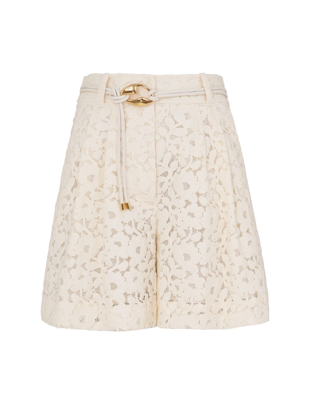 ITEM DETAILS The Illuminate Lace Short in Cream from our Spring 2025 Collection, Illumination. A lace high waisted short featuring side seam pockets and a removable belt. - Lace high waisted short - Side seam pockets - Adjustable and removable belt - Tucks throughout - Welt pockets on back - Centre front fly closure Style Code: 2999AS251 SIZE DETAILS 0P 0 1 2 3 4 Length 14 14 14 14 14 14 Waist 66 70 76 80 86 90 Fitted through the waist, relaxed through the legs This garment fits true to size Available in size 0P, suited to clients who are under 5'3"/ 160cm Model is 5'9.5"/178 cm, bust size 32C/10C and wears a size 0 Item measurements have been rounded to the nearest cm CARE INSTRUCTIONS Main: 76% cotton, 24% polyamide, lining: 100% cotton Dry clean only code f (hydrocarbon only); Remove any detachable trims prior to dry cleaning; Cover to protect trim; Do not iron; Light steam; Do not spot clean Always check the label or care card for specific care instructions.