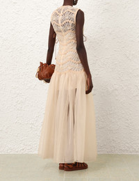 ITEM DETAILS The Illuminate Macrame Maxi Dress in Cream from our Spring 2025 Collection, Illumination. A silk organza maxi dress featuring macrame panel detail into a full skirt, side suede ties with beads on ends and zip closure at centre back. - Silk organza maxi dress - Macrame trim detail panel - Full skirt starting at the hip level - Zip closure at the centre back - Comes with separate slip Runway: This style was featured on the S25 Runway. Style Code: 4027DS251 SIZE DETAILS 0P 0 1 2 3 4 Length 54.5 58.5 58.5 58.5 59 59 Bust 27.5 29 31.5 33 35.5 37 Waist 25 27 28.5 30.5 32.5 34.5 Slim fit through the bodice, relaxed fit through the leg This garment fits true to size Available in size 0P, suited to clients who are under 5'3"/ 160cm Model is 5'9.5"/178 cm, bust size 32C/10C and wears a size 0 Item measurements are in inches CARE INSTRUCTIONS Main: 100% polyester; bodice lining: 100% polyester; skirt: 100% silk; slip: 100% silk Dry clean only code f (hydrocarbon only); Remove any detachable trims prior to dry cleaning; Cover to protect trim; Do not iron; Light steam; Do not spot clean Gentle cold hand wash separately with mild detergent Remove any detachable trims prior to cleaning Cover to protect trim; Do not soak, rub or wring Do not bleach Do not tumble dry Dry flat in shade Cool iron with protective cloth Do not spot clean Dry cleanable code p Always check the label or care card for specific care instructions.