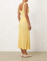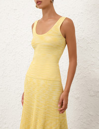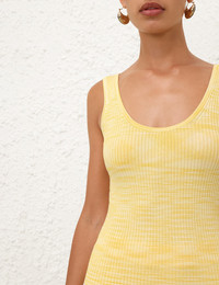 ITEM DETAILS The Illuminate Mouline Tank in Lemon from our Spring 2025 Collection, Illumination. A ribbed knit tank with a scoop neckline at the front and back. - Slim fit tank - Ribbed knit - Scoop neckline Style Code: 4029TS251 SIZE DETAILS 0P 0 1 2 3 4 Length 51 55 55 56 56 57 Bust 54 58 64 68 74 78 Waist 48 52 58 62 68 72 Slim fit This garment fits true to size Available in size 0P, suited to clients who are under 5'3"/ 160cm Model is 5'9.5"/178 cm, bust size 32C/10C and wears a size 0 Item measurements have been rounded to the nearest cm CARE INSTRUCTIONS 86% viscose 12% polyamide 2% elastane Dry clean only code f (hydrocarbon only); Remove any detachable trims prior to dry cleaning; Cover to protect trim; Cool iron with protective cloth; Do not spot clean; Store garment flat do not hang Always check the label or care card for specific care instructions.