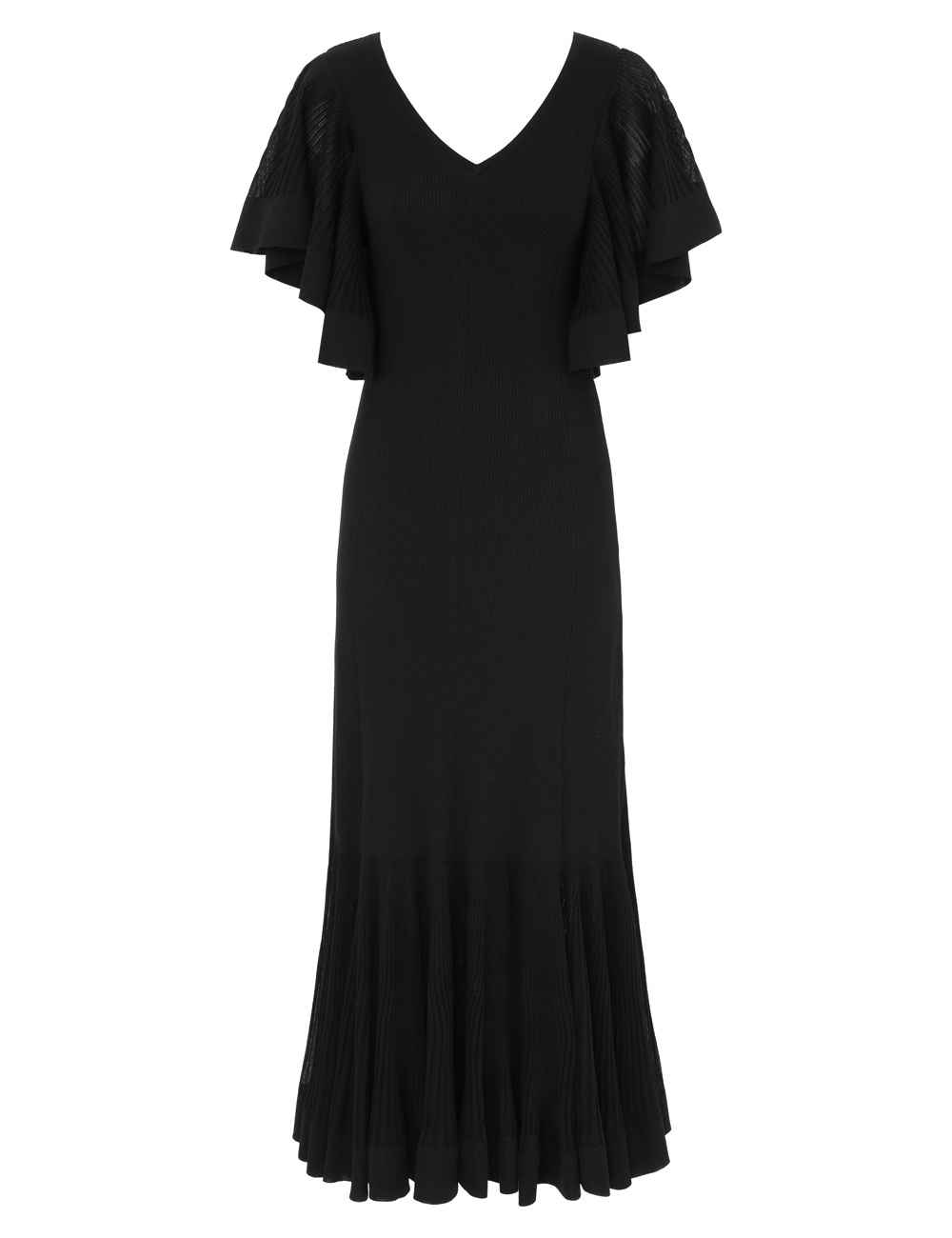 ITEM DETAILS The Illuminate Pleated Frill Maxi in Black from our Spring 2025 Collection, Illumination. A knit midi dress featuring a V-neckline with flutter sleeves, finished with ribbed texture throughout. - Knit midi dress - V-neckline - Flutter sleeves - Ribbed texture throughout - Slip on style Style Code: 3200DS251 SIZE DETAILS 0P 0 1 2 3 4 Length 117 127 128 129 129 130 Sleeve 23 24 25 26 26 27 Waist 48 54 58 64 68 74 Hip 60 66 70 76 80 86 Under bust 58 64 68 74 78 84 Slim fit through the bust and waist This garment fits true to size Available in size 0P, suited to clients who are under 5'3"/ 160cm Model is 5'9.5"/178 cm, bust size 32C/10C and wears a size 0 Item measurements have been rounded to the nearest cm CARE INSTRUCTIONS 60% viscose 26% polyester 13% polyamide 1% elastane Gentle cold hand wash separately with mild detergent Remove any detachable trims prior to cleaning Cover to protect trim; Do not soak, rub or wring Do not bleach Do not tumble dry Dry flat in shade Cool iron with protective cloth Do not spot clean; Store garment flat do not hang Dry cleanable code f (hydrocarbon only) Always check the label or care card for specific care instructions.