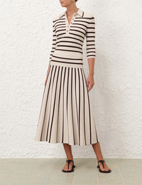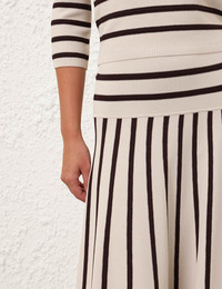 ITEM DETAILS The Illuminate Stripe Midi Skirt in Cream/Chocolate from our Spring 2025 Collection, Illumination. A knit midi skirt featuring contrast stripes, a thick elasticated waistband and a soft A-line silhouette. - Knit midi skirt - Contrast stripes - Elasticated waist - Soft A-line silhouette - Slip on style Style Code: 3990SS251 SIZE DETAILS 0P 0 1 2 3 4 Length 76 84 84 84 84 84 Waist 60 63 68 73 78 83 Elastic waist for an easy fit This garment fits true to size Available in size 0P, suited to clients who are under 5'3"/ 160cm Model is 5'9.5"/178 cm, bust size 32C/10C and wears a size 0 Item measurements have been rounded to the nearest cm CARE INSTRUCTIONS 86% viscose 12% polyamide 2% elastane Dry clean only code f (hydrocarbon only); Remove any detachable trims prior to dry cleaning; Cover to protect trim; Cool iron with protective cloth; Do not spot clean; Store garment flat do not hang Always check the label or care card for specific care instructions.