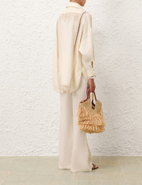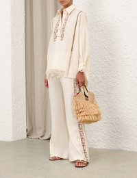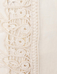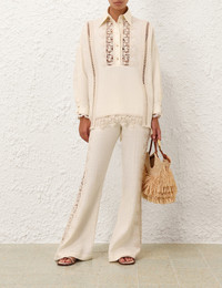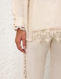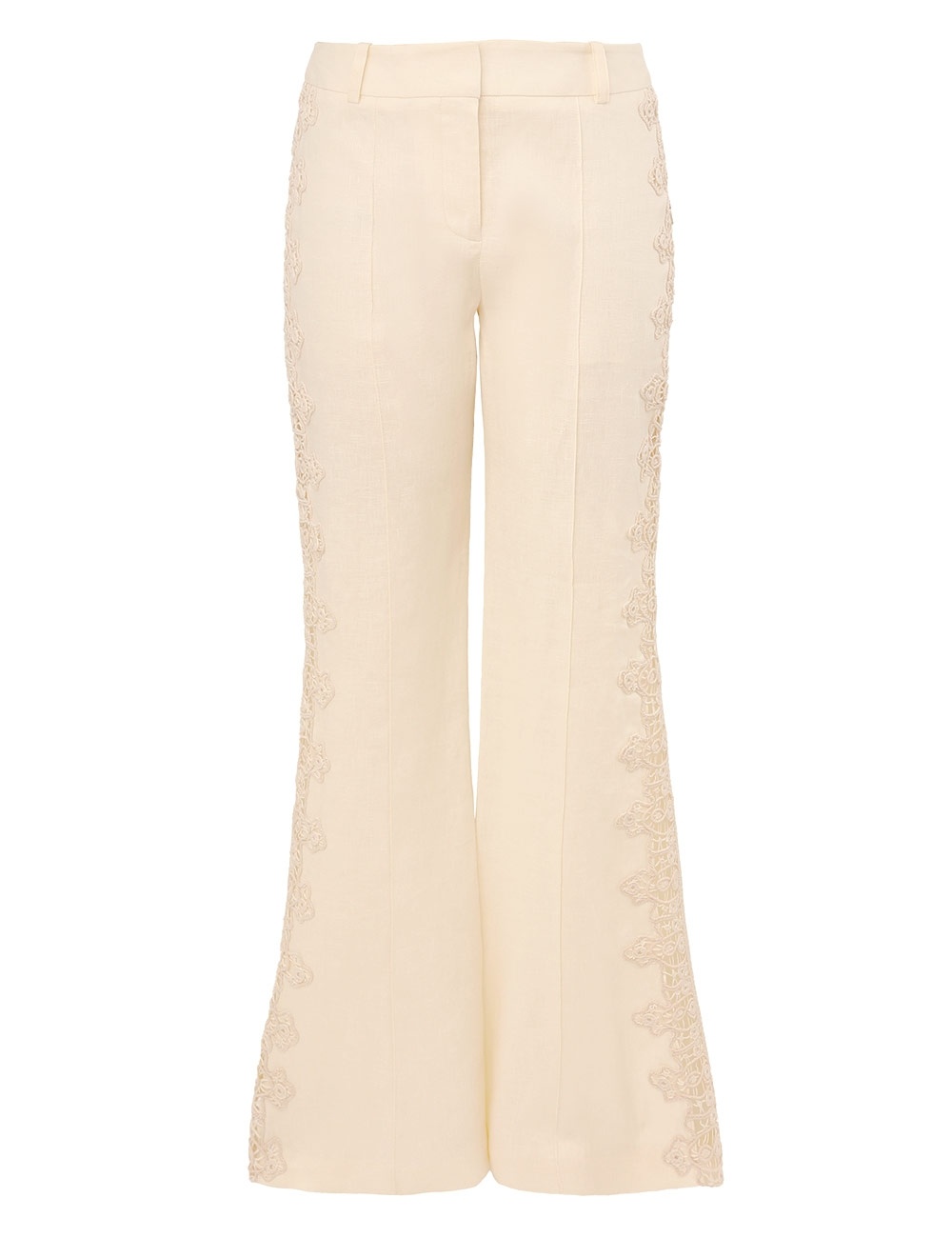 ITEM DETAILS The Illuminate Trimmed Flare Pant in Cream from our Spring 2025 Collection, Illumination. A flared linen pant featuring lace inserts at the sides, a fixed waistband, belt loops and back welt pockets. - Flared linen pant - Lace inserts at the sides - Fixed waistband - Belt loops - Back welt pockets Style Code: 3998PS251 SIZE DETAILS 0P 0 1 2 3 4 Length 101 109 110 110 111 111 Waist 71 74 79 84 89 94 Fitted through the waist and hips Relaxed through the legs This garment fits true to size Available in size 0P, suited to clients who are under 5'3"/ 160cm Model is 5'9.5"/178 cm, bust size 32C/10C and wears a size 0 Item measurements have been rounded to the nearest cm CARE INSTRUCTIONS Main: 100% linen; lining: 100% cotton; trim: 50% cotton, 40% viscose, 10% nylon Dry clean only code f (hydrocarbon only); Remove any detachable trims prior to dry cleaning; Cover to protect trim; Do not iron; Do not steam; Do not spot clean Always check the label or care card for specific care instructions.