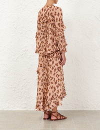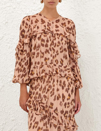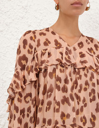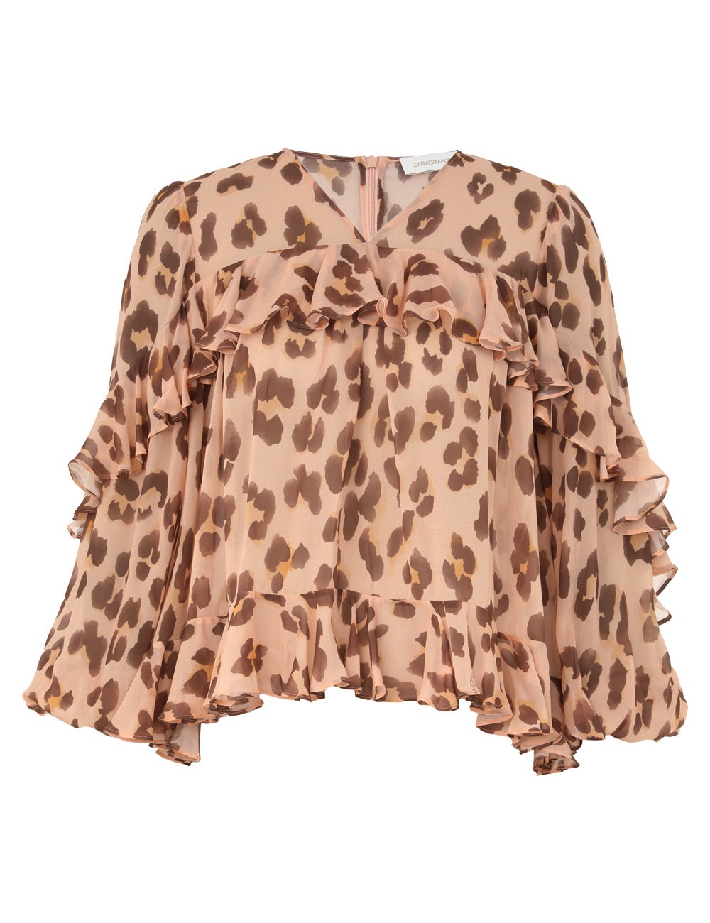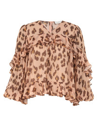 ITEM DETAILS The Illuminate V Neck Flutter Top in Peach Leopard from our Spring 2025 Collection, Illumination. A V-neck top featuring frills across the bust, shoulders and hem, finished with long blouson sleeves and elasticated cuffs. - V-neckline top - Centre back zip closure - Frill detailing throughout - Lined from the bust Style Code: 3505TS251 SIZE DETAILS 0P 0 1 2 3 4 Length 60 64 65 65 66 67 Bust 128 133 138 143 148 153 Sleeve 58 62 63 64 64 65 Designed for a slightly loose fit This garment fits true to size Available in size 0P, suited to clients who are under 5'3"/ 160cm Model is 5'9.5"/178 cm, bust size 32C/10C and wears a size 0 Item measurements have been rounded to the nearest cm CARE INSTRUCTIONS Main: 100% viscose Dry clean only code f (hydrocarbon only); Cover to protect trim; Cool iron with protective cloth; Do not spot clean ; Always check the label or care card for specific care instructions.