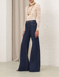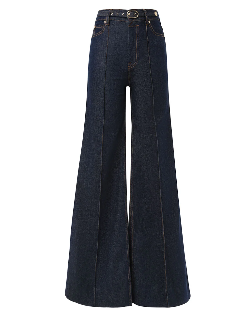 ITEM DETAILS The Wide Leg Jean in Ink from our Fall 2025 Collection, Hypnotic. A denim jean featuring a wide leg silhouette, finished with custom topstitching throughout and removable belt. - Denim jean - Flared leg silhouette - Removable belt - Topstitching throughout - Belt loops - Pockets throughout Style Code: 6589PF25R SIZE DETAILS 24 25 26 27 28 29 30 31 32 Waist 64 66 68 70 74 76 78 80 84 Hip 86 88 90 92 96 98 100 102 106 Length 117 117 117 118 118 118 119 119 119 Inseam 89 89 89 89 89 89 89 89 89 Fitted through the waist This garment fits true to size Available in size 0P, suited to clients who are under 5'3"/ 160cm Model is 5'9.5"/178 cm, bust size 32C/10C and wears a size 26 Item measurements have been rounded to the nearest cm CARE INSTRUCTIONS 82% cotton 17% lyocell 1% elastane Gentle cold machine wash separately with mild detergent; Remove any detachable trims prior to cleaning Cover to protect trim; Do not soak or bleach; Do not tumble dry; Dry in shade without delay; Cool iron with protective cloth; Do not spot clean; Dry cleanable code p Always check the label or care card for specific care instructions.