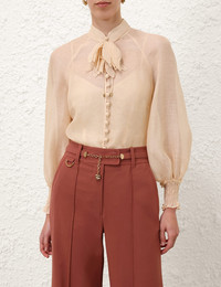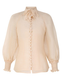 ITEM DETAILS The Illustration Buttoned Blouse in Cream from our Fall 2024 Collection, In Illustration. A silk linen organza long sleeve blouse featuring a detachable flower neck tie and shirred cuffs. - Silk linen organza blouse - Exaggerated sleeves - Stand collar - Semi sheer - Rouleau button loops - Comes with separate cami Style Code: 1021TF241 SIZE DETAILS 0P 0 1 2 3 4 Length 23.6 25.2 25.6 26 26 26.4 Bust 34.6 36.6 38.6 40.6 42.5 44.5 Sleeve 24 26 26.4 26.8 27.2 27.6 Slim fit This garment fits true to size Available in size 0P, suited to clients who are under 5'3"/ 160cm Model is 5'10"/178 cm, bust size 32B/10B and wears a size 0 Item measurements are in inches. CARE INSTRUCTIONS Main: 53% linen, 47% silk cami: 86% recycled polyester, 14% elastane Dry clean code f (hydrocarbon only), inside out in a protective bag Remove detachable trims and accessories prior to cleaning Cover to protect hardware Cool iron with protective cloth Do not spot clean Gentle cold hand wash inside out with mild detergent Remove detachable trims and accessories prior to washing Line dry in shade Do not soak, bleach or wring Do not tumble dry Cool iron on reverse side with protective cloth Do not spot clean Dry cleanable code p Always check the garment care label for specific care instructions.