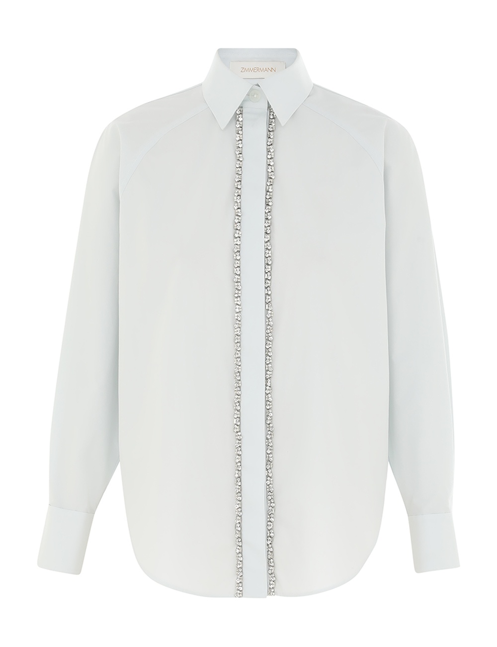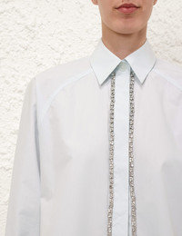 ITEM DETAILS The Illustration Embellished Shirt in Mint from our Fall 2024 Collection, In Illustration. A cotton poplin shirt featuring concealed buttons with a diamante trim down the centre front placket; finished with tucks at sleeve hem and buttoned cuffs. - Cotton embellished shirt - Stand collar - Diamante trim down the centre front - Long raglan sleeves with tucks at sleeve hem - Back pleat Runway: This style was featured on the Fall 2024 Runway. Style Code: 1379TF241 SIZE DETAILS 0P 0 1 2 3 Length 26.4 27.6 28 28.3 28.3 Bust 40.9 43.3 45.3 47.2 49.2 Sleeve 24 25.6 26 26.4 26.8 Relaxed fit This garment fits true to size Available in size 0P, suited to clients who are under 5'3"/ 160cm Model is 5'9.5"/178 cm, bust size 32C/10C and wears a size 0 Item measurements are in inches. CARE INSTRUCTIONS Main: 100% cotton Dry clean code f (hydrocarbon only), inside out in a protective bag Remove detachable trims and accessories prior to cleaning Cover to protect hardware Cool iron with protective cloth Do not spot clean Always check the garment care label for specific care instructions.