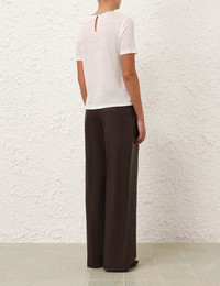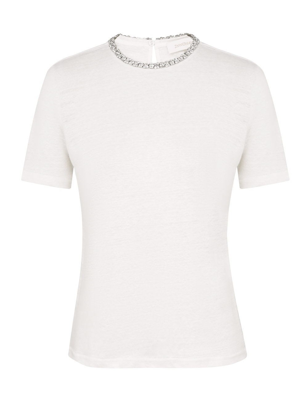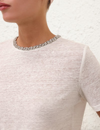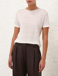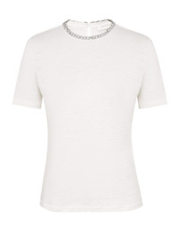 ITEM DETAILS The Illustration Embellished Tee in Ivory from our Fall 2024 Collection, In Illustration. A linen tee featuring short sleeves and an embellished neckline. - Fitted linen tee - Rounded embellished neckline - Short sleeves - Self cover button at centre back Style Code: 1121TF241 SIZE DETAILS 0P 0 1 2 3 Length 20.9 22 22.4 22.8 22.8 Bust 33.9 35.8 37.8 39.8 41.7 Sleeve 7.9 8.3 8.7 8.7 9.1 Fitted This garment fits true to size Available in size 0P, suited to clients who are under 5'3"/ 160cm Model is 5'10.5"/179 cm, bust size 34C/12C and wears a size 0 Item measurements are in inches. CARE INSTRUCTIONS Main: 100% linen Dry clean code f (hydrocarbon only), inside out in a protective bag Remove detachable trims and accessories prior to cleaning Cover to protect hardware Cool iron with protective cloth Do not spot clean Always check the garment care label for specific care instructions.