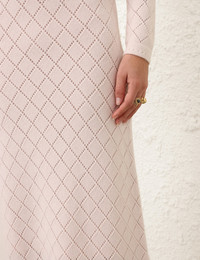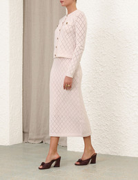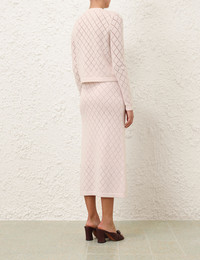 ITEM DETAILS The Illustration Pointelle Skirt in Blush from our Fall 2024 Collection, In Illustration. A wool knit midi skirt featuring an elasticated waist and a ribbed hem. - Wool knit midi skirt - Elastic waist - A-line silhouette - Ribbed hem - Fully lined Style Code: 0326SF241 SIZE DETAILS 0P 0 1 2 3 Length 29.9 32.7 32.7 32.7 32.7 Waist 24.4 25.6 27.6 29.5 31.5 Hip 29.1 31.1 33.1 35 37 Elasticated waistband for an easy fit This garment fits true to size Available in size 0P, suited to clients who are under 5'3"/ 160cm Model is 5'9"/175 cm, bust size 36B/14B and wears a size 0 Item measurements are in inches. CARE INSTRUCTIONS Main: 100% wool lining: 86% recycled post-consumer polyester, 14% elastane Gentle cold hand wash separately with mild detergent Remove detachable trims and accessories prior to washing Do not soak or wring Do not bleach Dry flat in shade Cool iron on reverse with protective cloth Do not tumble dry Do not spot clean Store garment flat do not hang Dry cleanable code f (hydrocarbon only) Always check the garment care label for specific care instructions.