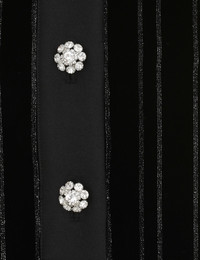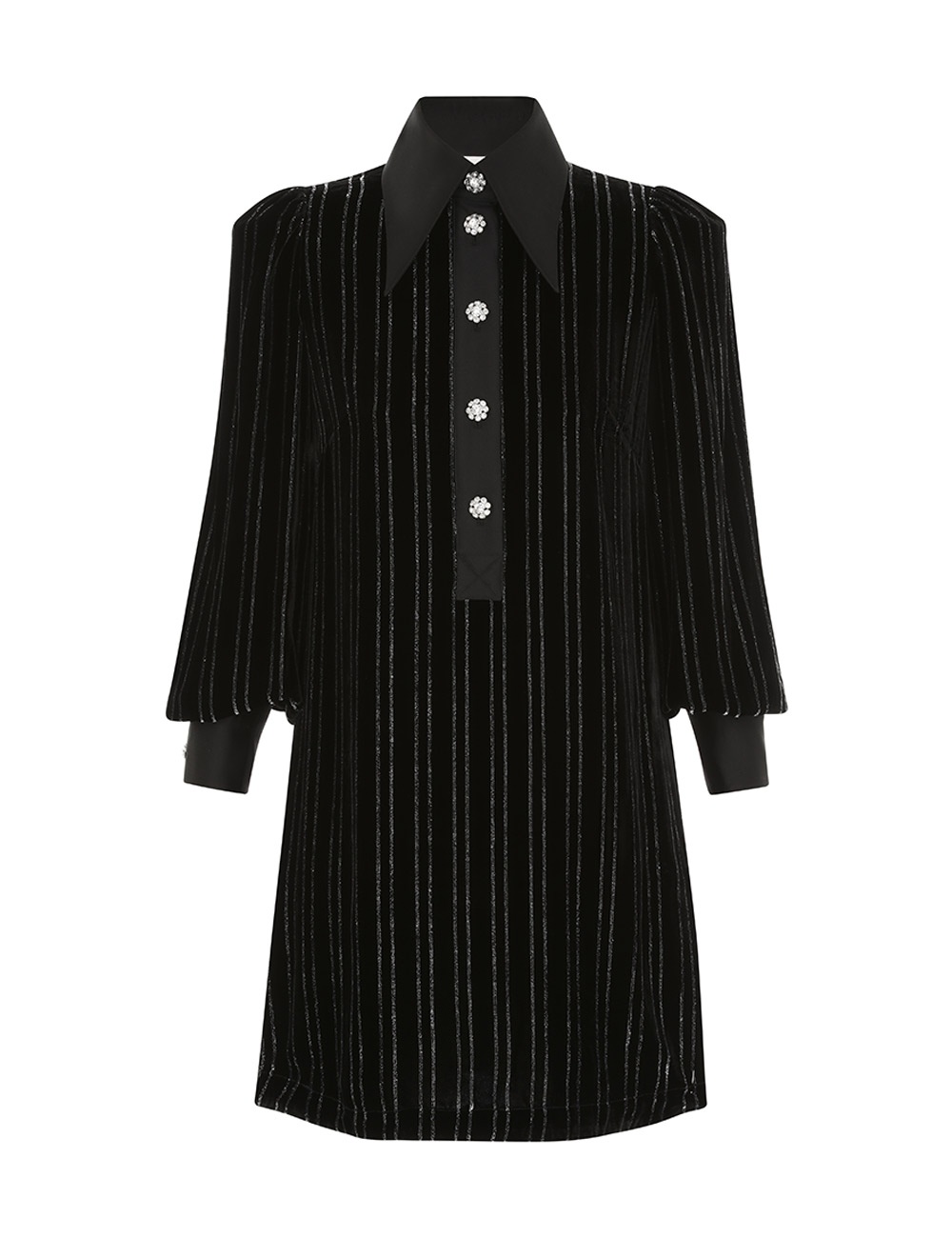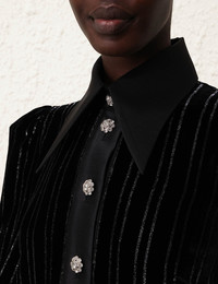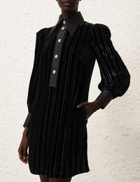 ITEM DETAILS The Illustration Velvet Mini Dress in Black/Silver from our Fall 2024 Collection, In Illustration. A velvet mini dress featuring crystal buttons down the centre front bodice, metallic stripes throughout and long sleeves with a tulle inserted sleeve head. - Velvet mini dress - Stand collar - Tucks at sleeve hem with buttoned cuffs - Front placket with crystal buttons Style Code: 1177DF241 SIZE DETAILS 0P 0 1 2 3 Length 31.5 33.9 34.3 34.6 35.4 Bust 33.9 35.8 38.2 40.2 42.1 Waist 33.9 35.8 37.8 39.8 42.1 Sleeve 21.7 23.2 23.6 23.6 24 Regular fit This garment fits true to size Available in size 0P, suited to clients who are under 5'3"/ 160cm Model is 5'9.5"/178 cm, bust size 32C/10C and wears a size 0 Item measurements are in inches. CARE INSTRUCTIONS Main: 72% viscose, 21% silk, 7% metallic contrast: 51% silk, 49% wool lining: 100% viscose Dry clean code f (hydrocarbon only), inside out in a protective bag Remove detachable trims and accessories prior to cleaning Cover to protect hardware Cool iron with protective cloth Do not spot clean Always check the garment care label for specific care instructions.