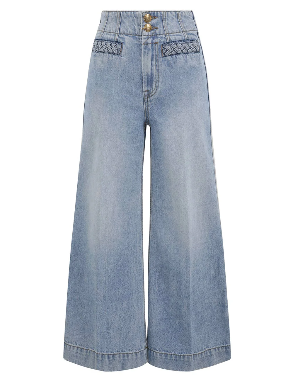 ITEM DETAILS The Indra Cropped Flare Jean in Skylark from our Summer Swim 2026 Collection. A denim cropped flare jean featuring a double button closure, functional back pockets and braided trim along the centre front pockets. - Denim-cotton fabric - High-rise, cropped-length pant - Double button closure at centre front - Braided detail at front welt pockets - Back pockets Style Code: 2726PSS262 SIZE DETAILS 24 25 26 27 28 29 30 31 32 Waist 60 62 64 68 70 72 76 78 80 Hip 82 86 88 90 94 96 98 100 104 Length 96 96 96 97 97 97 98 98 98 Inseam 68 68 68 68 68 68 68 68 68 Slightly fitted at the waist, relaxed through the legs High-rise waist with a cropped length pant This garment fits true to size Model is 5'9.5"/178 cm, bust size 32C/10C and wears a size 26 Item measurements have been rounded to the nearest cm CARE INSTRUCTIONS Main: 100% cotton; pocketing: 86% polyester, 14% cotton Gentle cold machine wash separately with mild detergent; Remove any detachable trims prior to cleaning Cover to protect trim; Do not soak or bleach; Do not tumble dry; Dry in shade without delay; Iron in low temperature with protective cloth; Do not spot clean; Dry cleanable code p Always check the label or care card for specific care instructions.