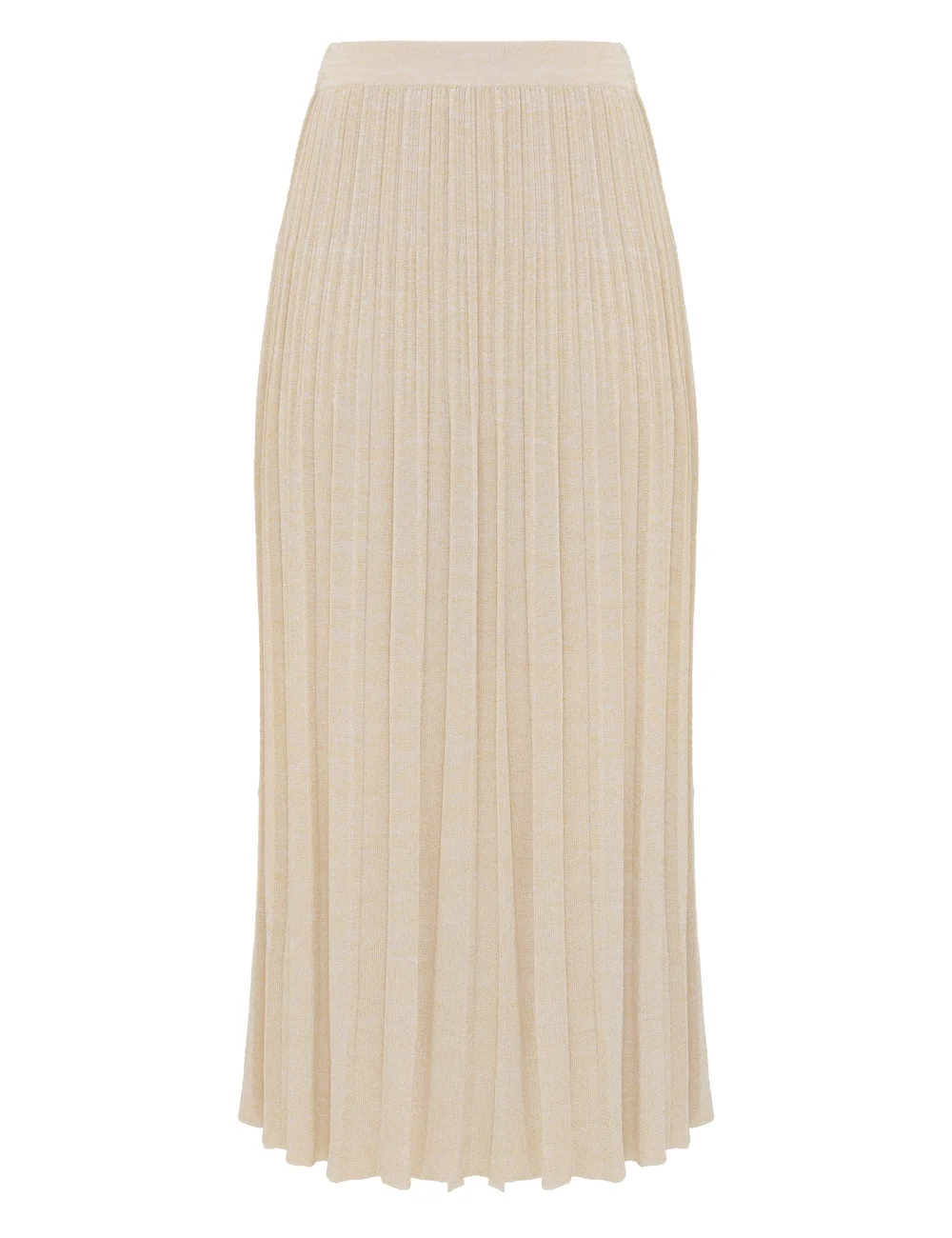 ITEM DETAILS The Indra Metallic Midi Skirt in Cream Metallic from our Summer Swim 2026 Collection. A ribbed knit midi skirt featuring an elasticated waistband and soft A-line silhouette. - Ribbed knit skirt - Elasticated waistband - Soft A-line silhouette - Slip on style Style Code: 4170SSS262 SIZE DETAILS 0P 0 1 2 3 Length 72 79 79 79 79 Waist 58 60 66 70 76 Hip 140 146 150 156 160 Elasticated waist for a relaxed fit This garment fits true to size Available in size 0P, suited to clients who are under 5'3"/ 160cm Model is 5'9.5"/178 cm, bust size 32C/10C and wears a size 0 Item measurements have been rounded to the nearest cm CARE INSTRUCTIONS Dry clean only code f (hydrocarbon only); Remove any detachable trims prior to dry cleaning; Cover to protect trim; Iron in low temperature with protective cloth; Do not spot clean; Store garment flat do not hang Always check the label or care card for specific care instructions.