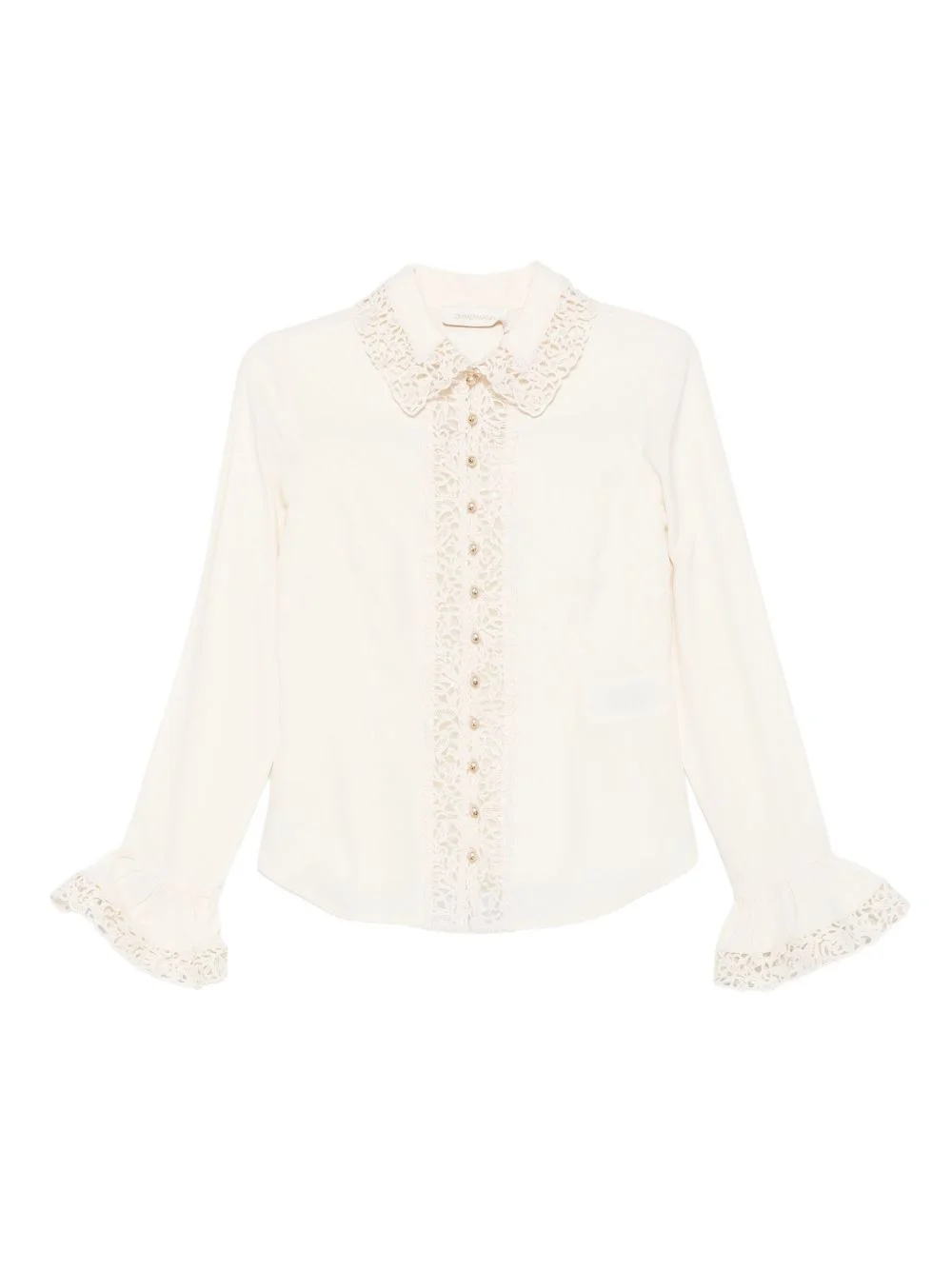 lace-trimmed blouse Highlights - Cream - Lace trim - Ruffled cuffs - Button fastening - Beaded embellishment - Collared neckline Made in Italy Composition Lining: Silk 100% Outer: Viscose 100% SIZE & FIT Model measurements Height 5 ft 10 in(1.77 m) Bust/Chest 33.07 in(84 cm) Hips 37 in(94 cm) Waist 24.8 in(63 cm) Washing instructions Read Manufacturer Guidelines