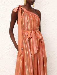 ITEM DETAILS The Junie Asymmetric Midi Dress in Caramel Multi from our Resort Swim 2024 Collection. A woven stripe midi dress featuring a one shoulder silhouette. - Stripe one shoulder midi dress - Gathering throughout neckline - Side pocket - Removable belt - Bow self tie strap Style Code: 8437DRS243 SIZE DETAILS 0P 0 1 2 3 Length 119 129 130 131 132 Bust 116 120 106 108 116 Designed for a relaxed fit This garment fits true to size Available in size 0P, suited to clients who are under 5'3"/ 160cm Model is 5'7.5"/175 cm, bust size 32C/10C and wears a size 0 Item measurements have been rounded to the nearest cm. CARE INSTRUCTIONS Main: 93% cotton, 7% metallic fibre Contrast: 100% cotton Exclusive of trims Dry clean only code p Cool iron Do not spot clean Always check the garment care label for specific care instructions.