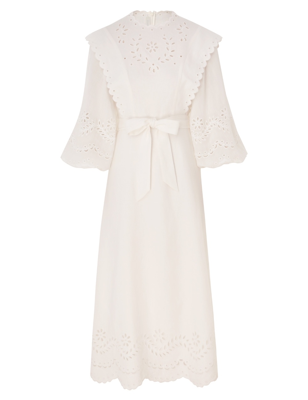 ITEM DETAILS The Junie Embroidered Midi Dress in Ivory from our Resort Swim 2024 Collection. A linen midi dress featuring placement scalloped embroidery, elasticated sleeve cuffs and a removable waist tie. - Linen midi dress - Gathered elasticated sleeve cuff - Centre back invisible zip - Scalloped hem Style Code: 9001DRS243 SIZE DETAILS 0P 0 1 2 3 Length 115 124 125 126 127 Bust 82 107 92 97 102 Waist 63 66 71 76 81 Sleeve 53 55 56 57 57 Relaxed fit through the body This garment fits true to size Available in size 0P, suited to clients who are under 5'3"/ 160cm Model is 5'9.5"/178 cm, bust size 32C/10C and wears a size 0 Item measurements have been rounded to the nearest cm. CARE INSTRUCTIONS Main: 100% linen Contrast:100% ramie Lining 100% cotton Embroidery: 100% polyester Exclusive of trims Dry clean only code p with protective bag Cool iron on reverse Turn garment inside out before dry cleaning Do not spot clean Always check the garment care label for specific care instructions.