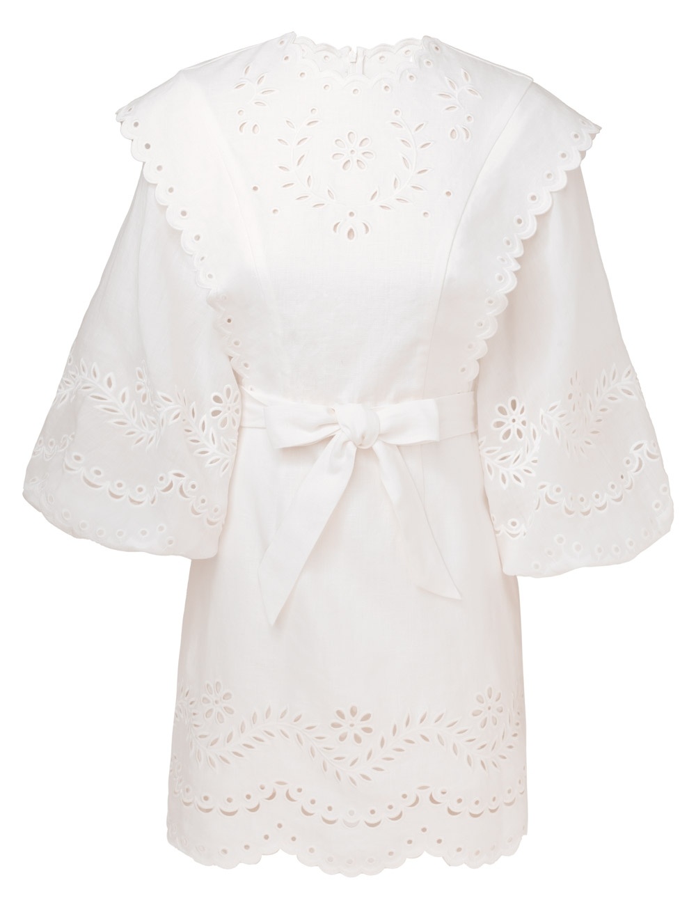 ITEM DETAILS The Junie Embroidered Mini Dress in Ivory from our Resort Swim 2024 Collection. A linen mini dress featuring placement scalloped embroidery, elasticated sleeve cuffs and a removable waist tie. - Linen mini dress - Gathered elasticated sleeve cuff - Centre back invisible zip - Scalloped hem Style Code: 8499DRS243 SIZE DETAILS 0P 0 1 2 3 Length 75 80 80 82 83 Bust 82 87 92 97 102 Waist 62 65 71 76 81 Hip 89 94 98 104 109 Sleeve 51 55 56 56 57 Relaxed fit through the body This garment fits true to size Available in size 0P, suited to clients who are under 5'3"/ 160cm Model is 5'9.5"/178 cm, bust size 32C/10C and wears a size 0 Item measurements have been rounded to the nearest cm. CARE INSTRUCTIONS Main: 100% linen Contrast:100% ramie Lining 100% cotton Embroidery: 100% polyester Exclusive of trims Dry clean only code p with protective bag Cool iron on reverse Turn garment inside out before dry cleaning Do not spot clean Always check the garment care label for specific care instructions.