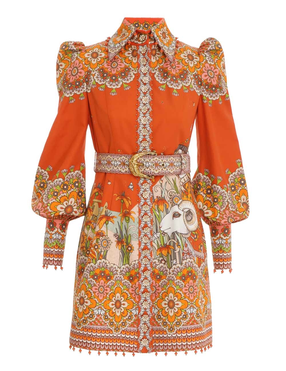 ITEM DETAILS The Kaleidoscope Aries Shirt Dress in Aries Zodiac Print from our Fall 2022 Collection, Stargazer. Silk twill mini dress featuring long blouson sleeves and beaded trims, finished with a removable belt and placement print throughout. - Silk twill mini dress - Beaded trim - Moon buckle belt - Blouson sleeve - Fabric artwork based on work by Anita Inverarity Style Code: 4684DKAL STYLING The Kaleidoscope Aries Shirt Dress appeared in Look 4 of our Fall 2022 Ready To Wear Collection, Stargazer. Style the dress with the Kaleidoscope Leggings and the Crescent Chain Sandal to complete the runway look or wear with the Crescent Stretch Tall Boot for your next evening out. Wear this style with the Statement Orb Earrings and Crescent Chain Sandal by ZIMMERMANN SIZE DETAILS 0P 0 1 2 3 4 Bust 82 86 92 98 102 108 Waist 70 72 78 84 88 94 Length 81 87 88 88 90 92 Sleeve 60 64 65 65 66 67 This garment fits true to size, we recommend you select your normal size. Tailored through top, relaxed through bottom. Available in size 0P, specially designed with petite proportions that are suited to clients who are under 5'3"/ 160cm. Our model is 5'9" / 175 cm, bust size 36DD/14DD and is wearing a size 2. Fabric artwork based on work by Anita Inverarity CARE INSTRUCTIONS Main: 70% cotton 30% silk Lining: 100% cotton Exclusive of trims Remove belt before dry cleaning Dry clean only code f with protective bag Cool iron with protective cloth Light steam only Do not spot clean Cover and protect hardware Turn garment inside out before dry cleaning Always check the garment care label for specific care instructions