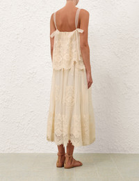 ITEM DETAILS The Luna Tiered Lace Slip in Cream from our Spring 2026 Collection, Kindred Spirit. A tiered maxi dress featuring a square neckline, rouleau self-tie straps, heavy gathering throughout, finished with a cascading ruffle overlay. - Sleeveless, full-length dress - Cropped fit overlay across bust - Self-tie rouleau straps - Invisible centre back zip closure - Tiered frills throughout - Scalloped lace trim - Lined Style Code: 6032DS261 SIZE DETAILS 0P 0 1 2 3 4 Length 38.5 42 42 42 42 42 Bust 30 32.5 34 36 38 40 Relaxed fit Heavy-weight, non-stretchy fabric This garment fits true to size Available in size 0P, suited to clients who are under 5'3"/ 160cm Model is 5'9.5"/178 cm, bust size 32C/10C and wears a size 0 Item measurements are in inches CARE INSTRUCTIONS Main: 100% polyester; lining: 100% viscose Dry clean only code f (hydrocarbon only); Remove any detachable trims prior to dry cleaning; Cover to protect trim; Iron in low temperature with protective cloth; Light steam only; Do not spot clean Always check the label or care card for specific care instructions.