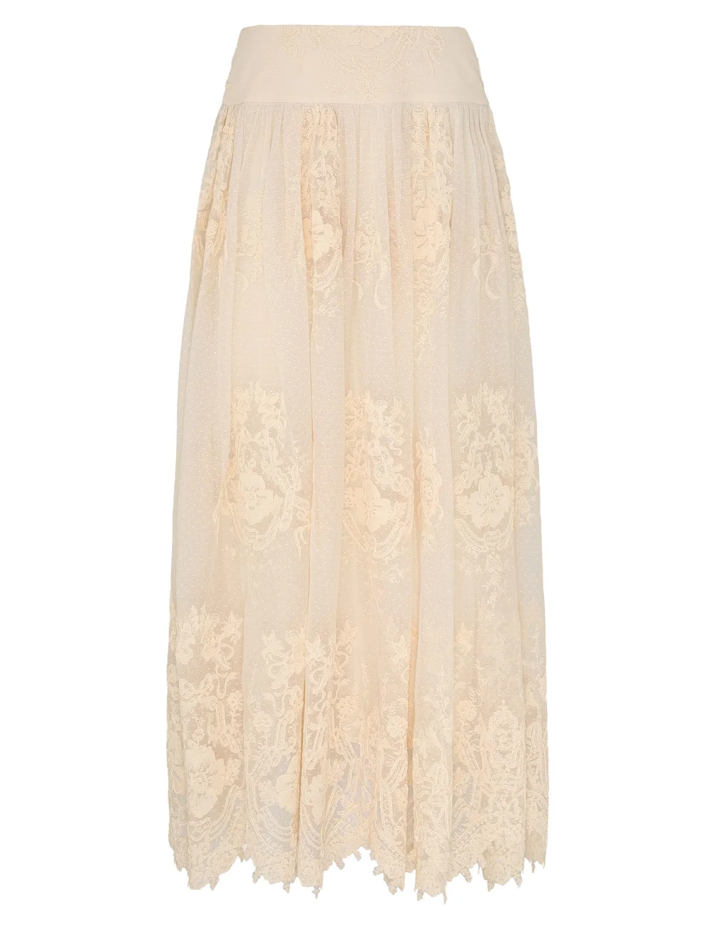 ITEM DETAILS The Luna Lace Maxi Skirt in Cream from our Spring 2026 Collection, Kindred Spirit. A maxi skirt featuring a fixed waistband and lace detailing throughout. - Gathered maxi skirt - Lace trim along scalloped hem - Soft A-line silhouette - Invisible zip at centre back - Lined Style Code: 6029SS261 SIZE DETAILS 0P 0 1 2 3 4 Length 86 93 93 93 93 93 Waist 64 68 74 78 84 88 Hip 80 86 92 96 102 106 Fitted at the waist, relaxed through the hips and legs This garment fits true to size Available in size 0P, suited to clients who are under 5'3"/ 160cm Model is 5'9.5"/178 cm, bust size 32C/10C and wears a size 0 Item measurements have been rounded to the nearest cm CARE INSTRUCTIONS Main: 100% polyester; lining: 100% viscose Dry clean only code f (hydrocarbon only); Remove any detachable trims prior to dry cleaning; Cover to protect trim; Iron in low temperature with protective cloth; Light steam only; Do not spot clean Always check the label or care card for specific care instructions.