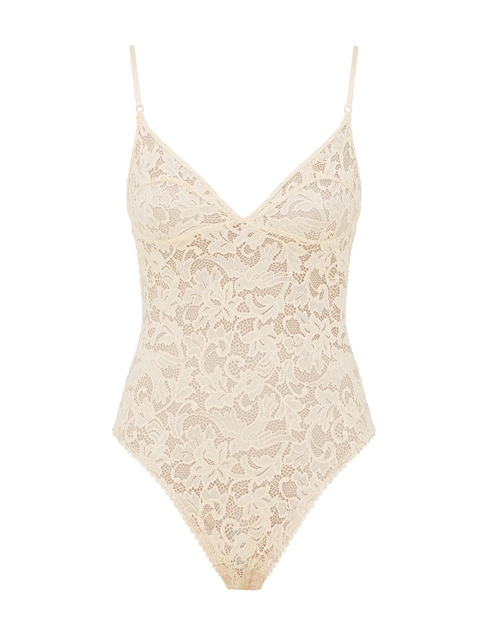 ITEM DETAILS The Lace Sleeveless Bodysuit in Cream from our Spring 2026 Collection, Kindred Spirit. A stretch bodysuit featuring a plunging V-neckline, adjustable straps and all-over lace detailing. - Sleeveless bodysuit - V-neckline and back - Mock wire detailing at the bust - Adjustable straps for flexible fit - Gusset snap fastening - Mesh lining Style Code: 7829TS26R SIZE DETAILS 0 1 2 3 4 Length 19.5 19.5 20 20.5 21 Waist 23.5 26 27.5 30 31.5 Hip 29 30.5 33 35.5 37 Stretch lace for a flexible fit Light-weight, stretchy fabric This garment fits true to size Model is 5'10.5"/179 cm, bust size 34C/12C and wears a size 0 Item measurements are in inches CARE INSTRUCTIONS Main: 90% polyamide, 10% elastane; lining: 81% polyester, 19% elastane Gentle cold hand wash separately with mild detergent Remove any detachable trims prior to cleaning Cover to protect trim; Do not soak, rub or wring Do not bleach Do not tumble dry Dry in shade Do not iron Do not spot clean Dry cleanable code f (hydrocarbon only) Always check the label or care card for specific care instructions.