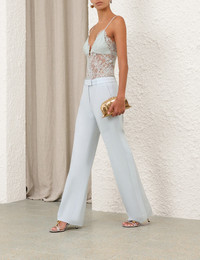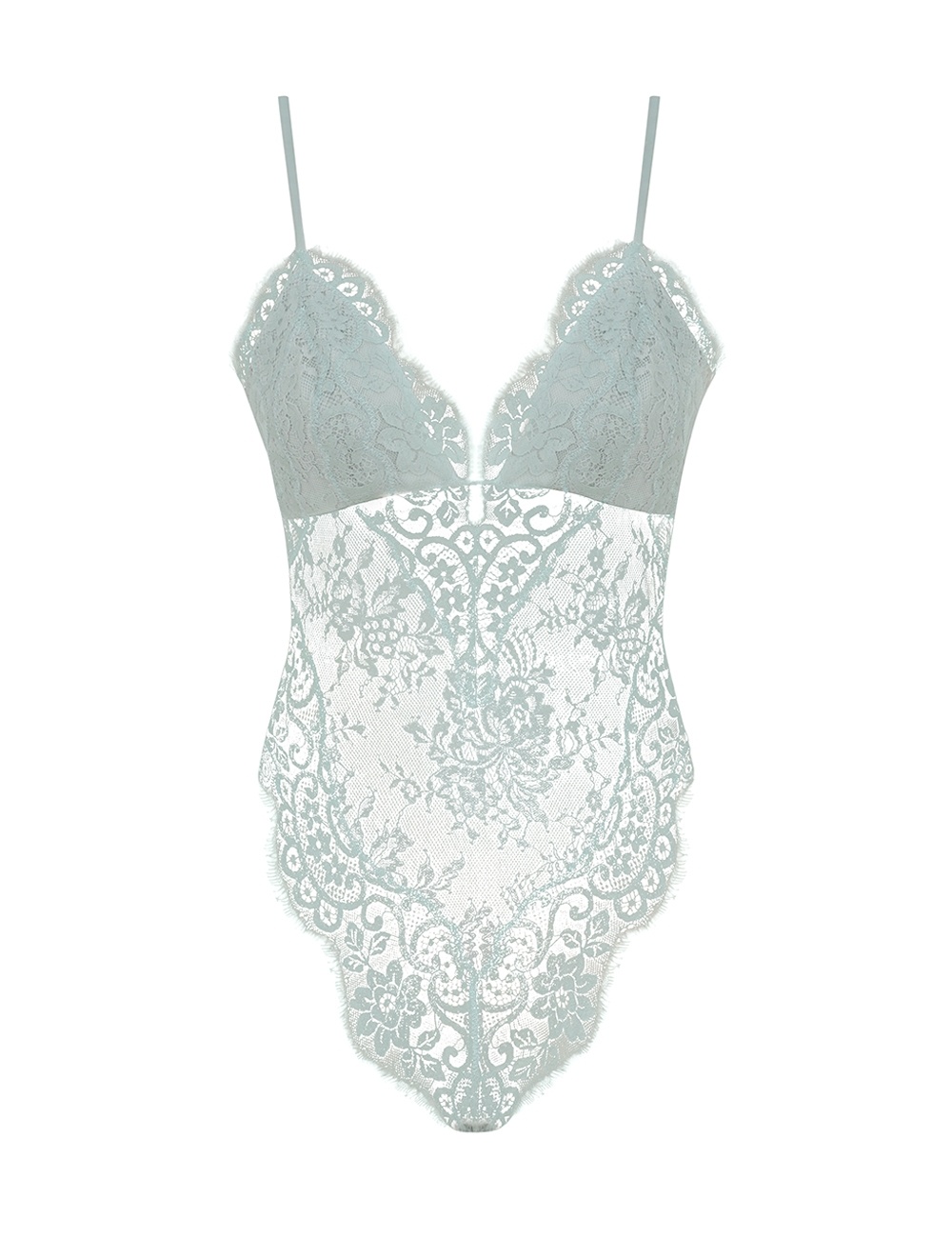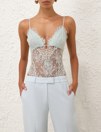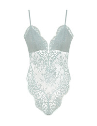 ITEM DETAILS The Lace Teddy in Sea Foam from our Spring 2025 Collection, Illumination. A lace bodysuit featuring an invisible centre back zip closure and adjustable straps. - Lace teddy - Organza lining in bust - Invisible centre back zip - Adjustable straps Style Code: 1300TS25R SIZE DETAILS 0P 0 1 2 3 4 Length 55 59 61 63 65 67 Waist 62 67 72 78 82 88 Fitted throughout This garment fits true to size Available in size 0P, suited to clients who are under 5'3"/ 160cm Model is 5'9.5"/178 cm, bust size 32C/10C and wears a size 0 Item measurements have been rounded to the nearest cm CARE INSTRUCTIONS Main: 55% polyamide, 45% cotton, lining 1: 100% viscose, lining 2: 100% silk, trim: 62% cotton, 38% polyamide Dry clean only code f (hydrocarbon only); Remove any detachable trims prior to dry cleaning; Cover to protect trim; Do not steam; Cool iron with protective cloth; Do not spot clean Always check the label or care card for specific care instructions.