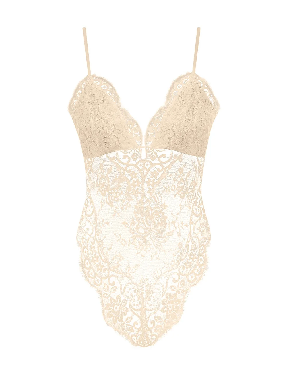 ITEM DETAILS The Lace Teddy in Cream from our Fall 2025 Collection, Hypnotic. A lace bodysuit featuring an invisible centre back zip closure and adjustable straps. - Lace teddy - Organza lining in bust - Invisible centre back zip - Adjustable straps Style Code: 1300TF25R SIZE DETAILS 0P 0 1 2 3 4 Length 55 59 61 63 65 67 Waist 62 67 72 78 82 88 Fitted throughout This garment fits true to size Available in size 0P, suited to clients who are under 5'3"/ 160cm Model is 5'9.5"/178 cm, bust size 32C/10C and wears a size 0 Item measurements have been rounded to the nearest cm CARE INSTRUCTIONS Main: 55% polyamide, 45% cotton; lining 1: 100% viscose; lining 2: 100% silk; trim: 62% cotton, 38% polyamide Dry clean only code f (hydrocarbon only); Remove any detachable trims prior to dry cleaning; Cover to protect trim; Do not steam; Cool iron with protective cloth; Do not spot clean Always check the label or care card for specific care instructions.