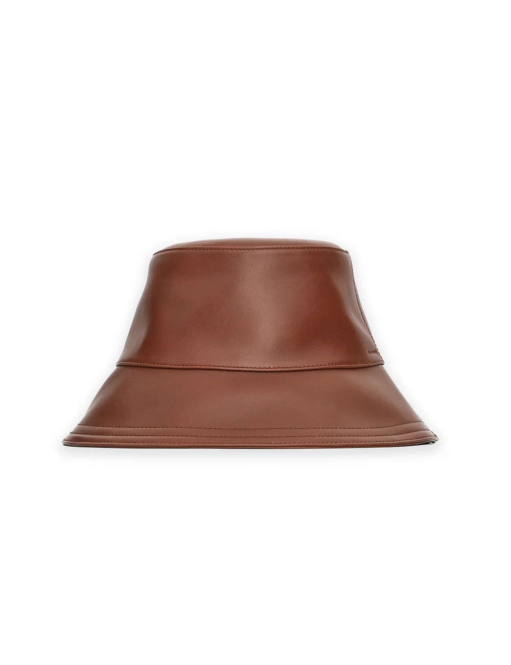 ITEM DETAILS The Leather Bucket Hat in Tan from our Fall 2025 Collection, Hypnotic. A leather bucket hat with a tall crown. - Calf leather - Bucket hat - Tall crown Style Code: 5774XF25A1 SIZE DETAILS One size. CARE INSTRUCTIONS Main: cow leather lining: 100% cotton Your handcrafted item is made from high-quality leather which features natural variations in tone, grain, and texture. Colours may fade with exposure to light and heat, and humidity can lead to colour transfers onto lighter fabrics. Protect your item from direct contact with water, solvents, oils, perfumes, and cosmetics which can cause irreversible damage. Store in a dry environment in the original dust bag Always check the label or care card for specific care instructions.