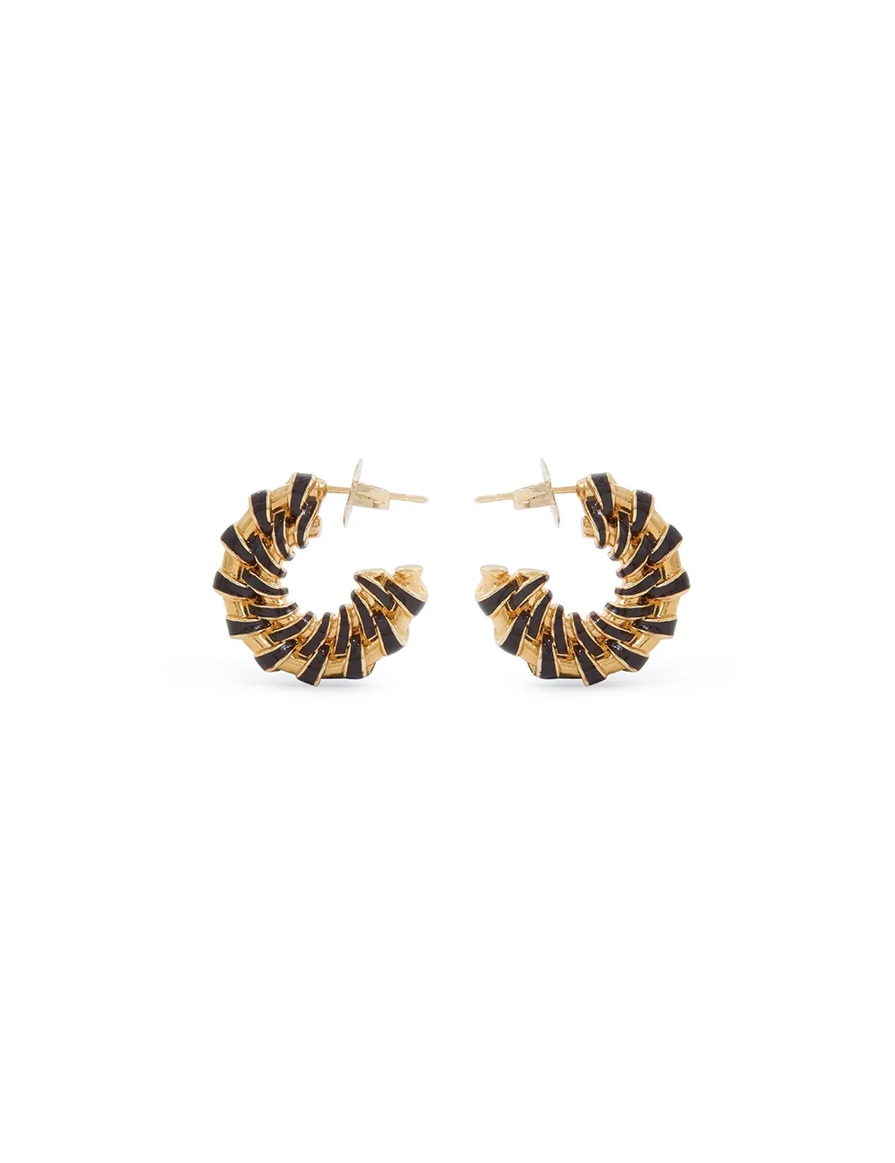 ITEM DETAILS The Loom Mini Hoops in Gold/Burgundy from our Fall 2025 Collection, Hypnotic. A gold plated statement earring featuring twisted brass detailing and a stud post back. - 12KT gold plated brass hoops - Enamel detailing in deep burgundy hues - Stud post back - Sold as a pair Style Code: 5049XF25A1 SIZE DETAILS Suitable for pierced ears. Sold as a pair. CARE INSTRUCTIONS 60% brass 35% enamel 5% stainless steel Zimmermann jewellery is made from 12kt gold-plated brass Please remove during exercise, showering, or swimming Keep enamel pieces away from perfumes, acetones, creams, and water to prevent damage or discoloration Clean with warm water, mild soap, and a soft cloth Store in a cool, dry place, away from sunlight and heat Always check the label or care card for specific care instructions.
