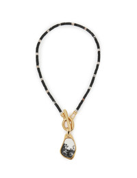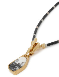 ITEM DETAILS The Ore Pendant in Gold/Black from our Spring 2025 Collection, Illumination. A beaded necklace featuring a custom cut Dalmation Jasper stone set in 24kt gold plating with a beaded chain and metallic gold accents. - Dalmation Jasper stone - 12KT gold plated stone enclosure - Organic shape pendant - T-bar clasp Style Code: 3800XS25A1 SIZE DETAILS CARE INSTRUCTIONS 55% obsidian 30% brass 15% dalmation jasper Our semi-precious stones are hand-cut to enhance their natural beauty, with unique variations in each piece. A zimmermann jewellery is made from 12kt gold-plated brass. A please remove during exercise, showering, or swimming. A keep away from perfumes, acetones, creams, and water to prevent damage or discoloration. A clean gently with a soft, lint-free clothaavoid cleaning products. A store in a cool, dry place, away from direct sunlight and heat.