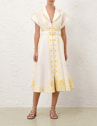 ITEM DETAILS The Lucky Embroidered Midi Dress in Ivory/Lemon from our Summer Swim 2025 Collection. A linen midi dress featuring a plunging V-neckline, a classic collar with scalloped edging and short folded sleeves, finished with a removable belt at the waist. - 100% linen fabric - Crochet flower buttons down the centre front - Side seam pockets - Scalloped edging along collar and hem - Removable self covered buckle belt - Comes with a separate slip Style Code: 4591DSS252 SIZE DETAILS 0P 0 1 2 3 4 Length 47.5 52.5 53 53 53 53.5 Bust 34.5 37 38.5 41 42.5 45 Waist 26 27 29 30.5 33 34.5 Sleeve 23.5 25 25 25.5 26 26 Designed for a loose fit, with a closer fit at the waist This garment fits true to size Available in size 0P, suited to clients who are under 5'3"/ 160cm Model is 5'9.5"/178 cm, bust size 32C/10C and wears a size 0 Item measurements are in inches CARE INSTRUCTIONS Main: 100% linen; embroidery: 100% polyester; lining: 100% cotton; slip: 86% recycled polyester, 14% elastane Dry clean only code f (hydrocarbon only); Remove any detachable trims prior to dry cleaning; Cover to protect trim; Cool iron with protective cloth; Light steam only; Do not spot clean Gentle cold hand wash separately with mild detergent; Remove any detachable trims prior to cleaning; Cover to protect trim; Do not soak, rub or wring; Do not bleach; Dry in shade; Cool iron with protective cloth; Do not tumble dry; Do not spot clean; Dry cleanable code f (hydrocarbon only); Always check the label or care card for specific care instructions.