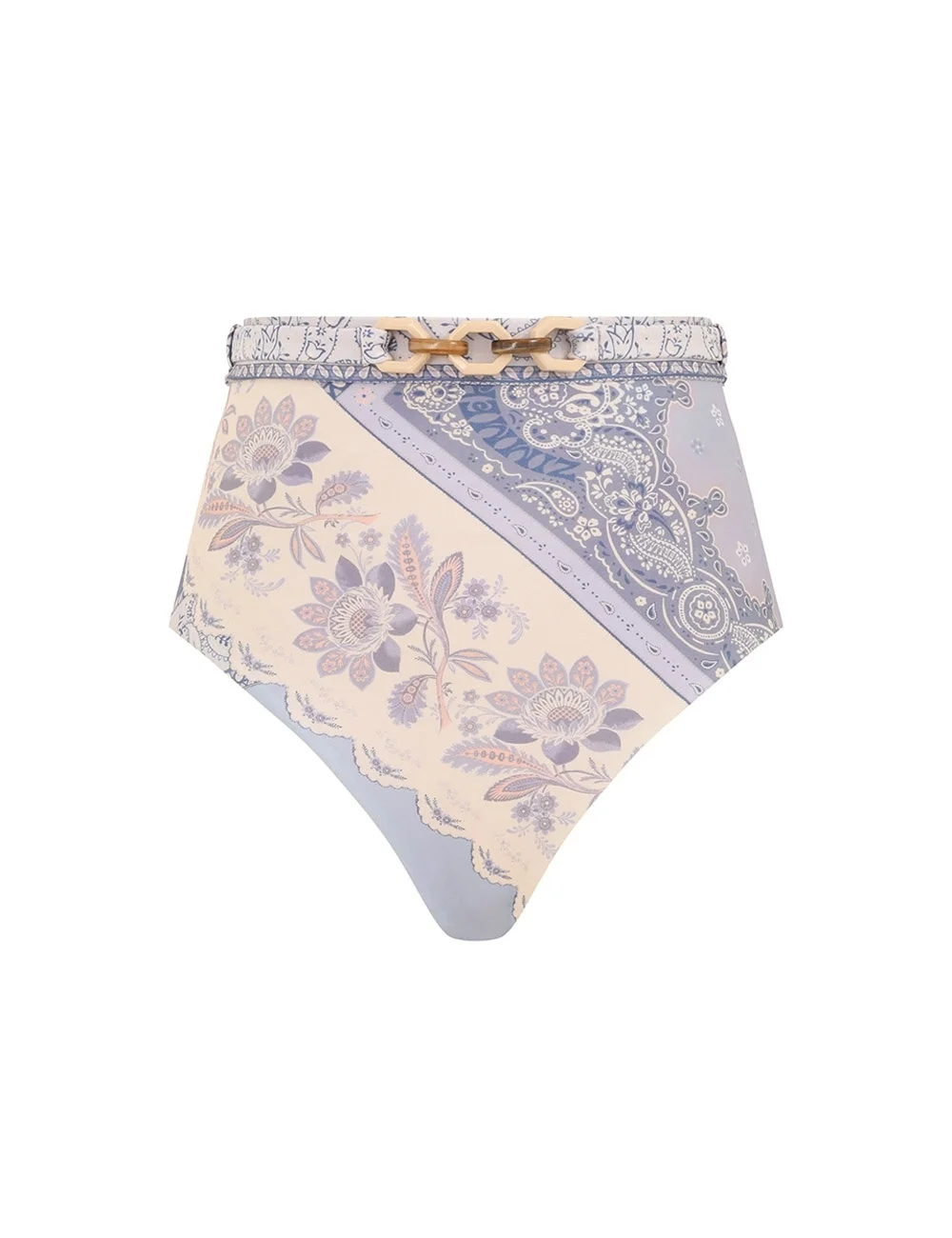 ITEM DETAILS The Lucky High Waist Pant in Blue Bandana from our Summer Swim 2025 Collection. A high waisted bikini pant constructed from form-fitting lycra featuring full bottom coverage, a waist belt with chain centre detail and ZIMMERMANN clip fastening. - Lycra with shiny finish - High waisted bikini pant with full coverage - Belt loops with removable waist belt - Lined - Pant only, bra sold separately Style Code: 4626WSS252 SIZE DETAILS This garment fits true to size Model is 5'10.5"/179 cm, bust size 34C/12C and wears a size 0 CARE INSTRUCTIONS Main: 80% polyamide, 20% elastane; lining: 92% recycled nylon, 8% spandex Do not roll up when wet; Rinse thoroughly after use; Remove any detachable trims prior to washing; Cold hand wash separately with mild detergent, avoid fabric softener; Dry in shade; Do not bleach or iron; Do not tumble dry; Do not dry clean; Light colours may be transparent when wet; Avoid contact with sunscreens, oils and rough surfaces; Avoid high temperature pools and spas treated with harsh chemicals Always check the label or care card for specific care instructions.