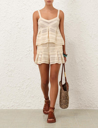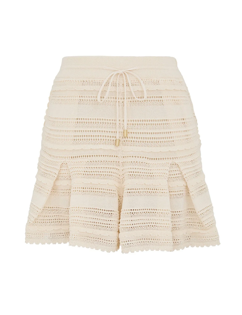 ITEM DETAILS The Lucky Lace Knit Short in Cream from our Summer Swim 2025 Collection. A knit short featuring an elasticated waistband and scalloped trim. - Knit fabric - Drawstring waist with toggle ends - Functional front pockets - Scalloped trim Style Code: 3001ASS252 SIZE DETAILS 0P 0 1 2 3 Length 30 33 34 34 35 Waist 60 62 68 74 78 Hip 88 92 98 104 108 Inseam 7 7 7 7 7 Designed with an elasticated waistband for a flexible fit This garment fits true to size Available in size 0P, suited to clients who are under 5'3"/ 160cm Model is 5'9.5"/178 cm, bust size 32C/10C and wears a size 0 CARE INSTRUCTIONS Main : 58% paper yarn 42% polyester lining : 100% cotton Gentle cold hand wash separately with mild detergent Remove any detachable trims prior to cleaning Cover to protect trim; Do not soak, rub or wring Do not bleach Do not tumble dry Dry flat in shade Cool iron with protective cloth Do not spot clean; Store garment flat do not hang Dry cleanable code f (hydrocarbon only) Always check the label or care card for specific care instructions.
