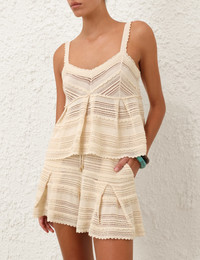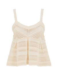 ITEM DETAILS The Lucky Lace Knit Tank in Cream from our Summer Swim 2025 Collection. A knit top featuring a V-neckline and frilled, loose fit hem. - Knit fabric - Cropped length - Scalloped trim - Lace detailing - Loose fit Style Code: 3084TSS252 SIZE DETAILS 0P 0 1 2 3 4 Length 26 28 28 28 28 28 Bust 70 74 80 86 90 96 Designed for a slightly loose fit, with a closer fit at the bust This garment fits true to size Available in size 0P, suited to clients who are under 5'3"/ 160cm Model is 5'9.5"/178 cm, bust size 32C/10C and wears a size 0 CARE INSTRUCTIONS 58% paper yarn 42% polyester Gentle cold hand wash separately with mild detergent Remove any detachable trims prior to cleaning Cover to protect trim; Do not soak, rub or wring Do not bleach Do not tumble dry Dry flat in shade Cool iron with protective cloth Do not spot clean; Store garment flat do not hang Dry cleanable code f (hydrocarbon only) Always check the label or care card for specific care instructions.